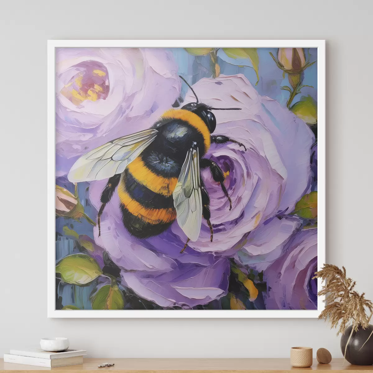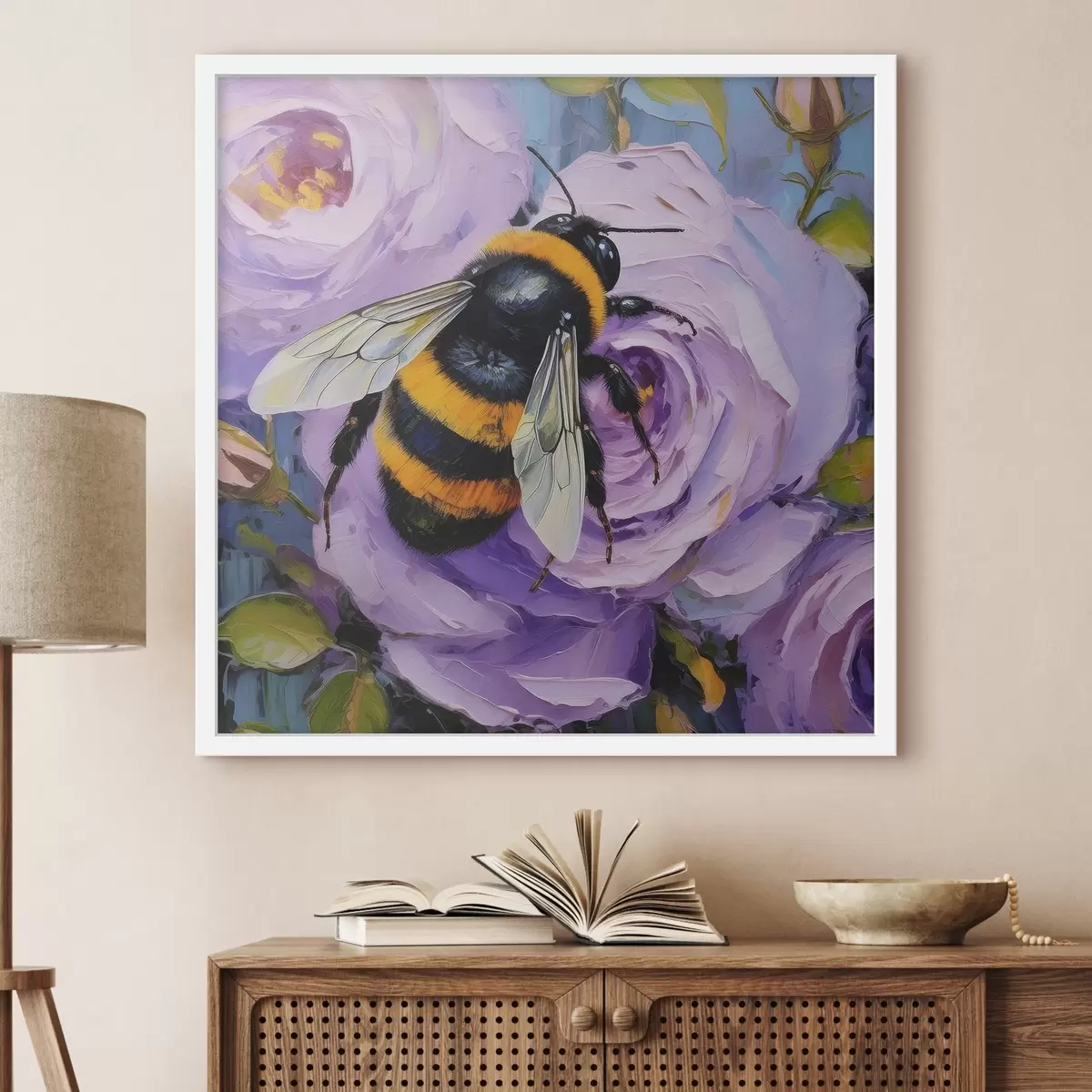 Plakatas Bitė ant rausvų bijūnų, vasaros gėlės, tapyba aliejiniais dažais, ryškūs potėpiai teptuku f39410