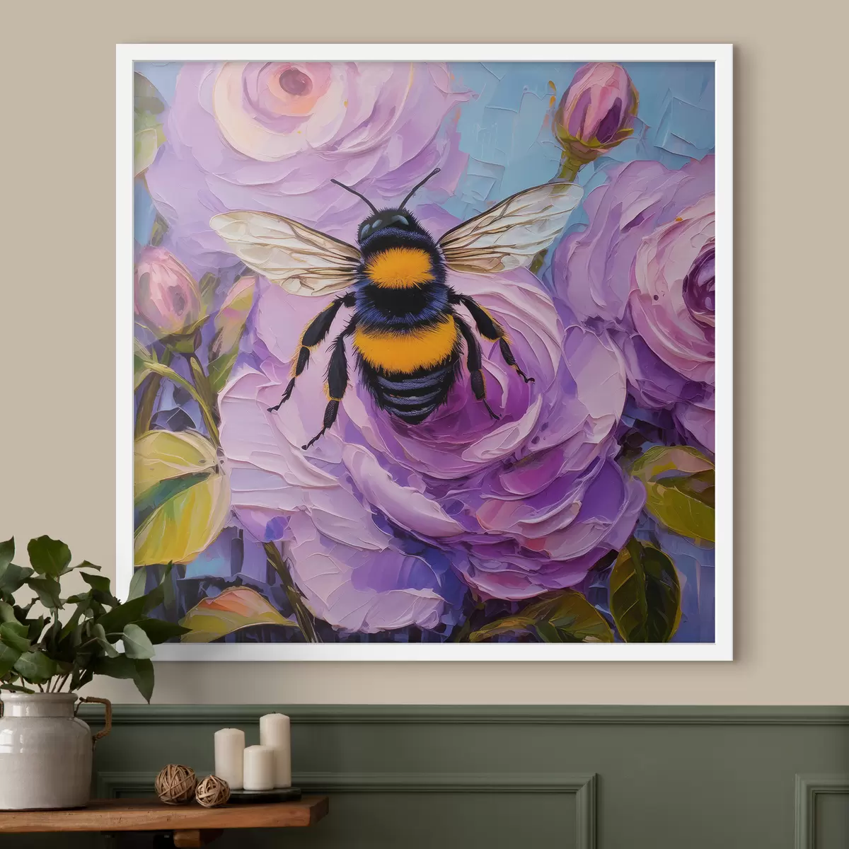 Plakatas Bitė ant rožinių bijūnų, spalvingos vasaros gėlės, tapyba aliejiniais dažais, ryškūs potėpiai teptuku Ne f39411