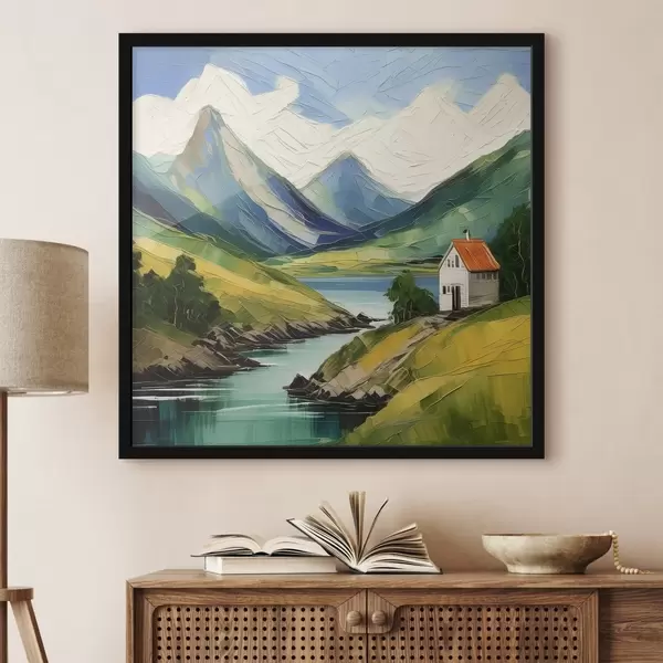 Plakatas Norvegijos kraštovaizdis, žaluma, gražūs kalnai, nedidelis namas, gamta, akrilo menas Ne f39422