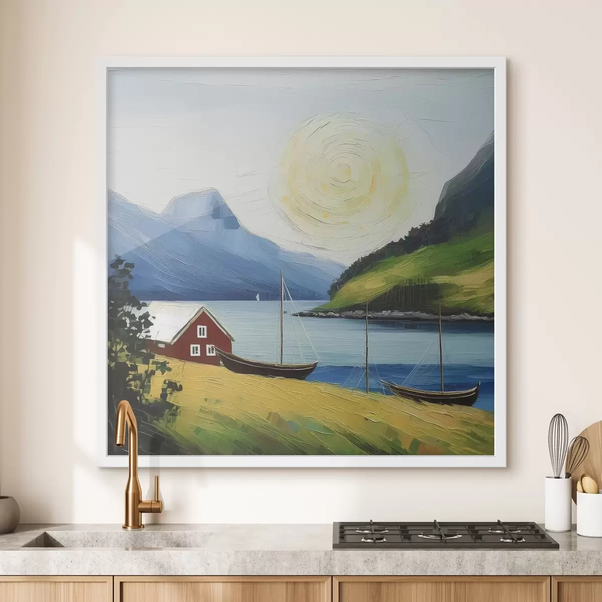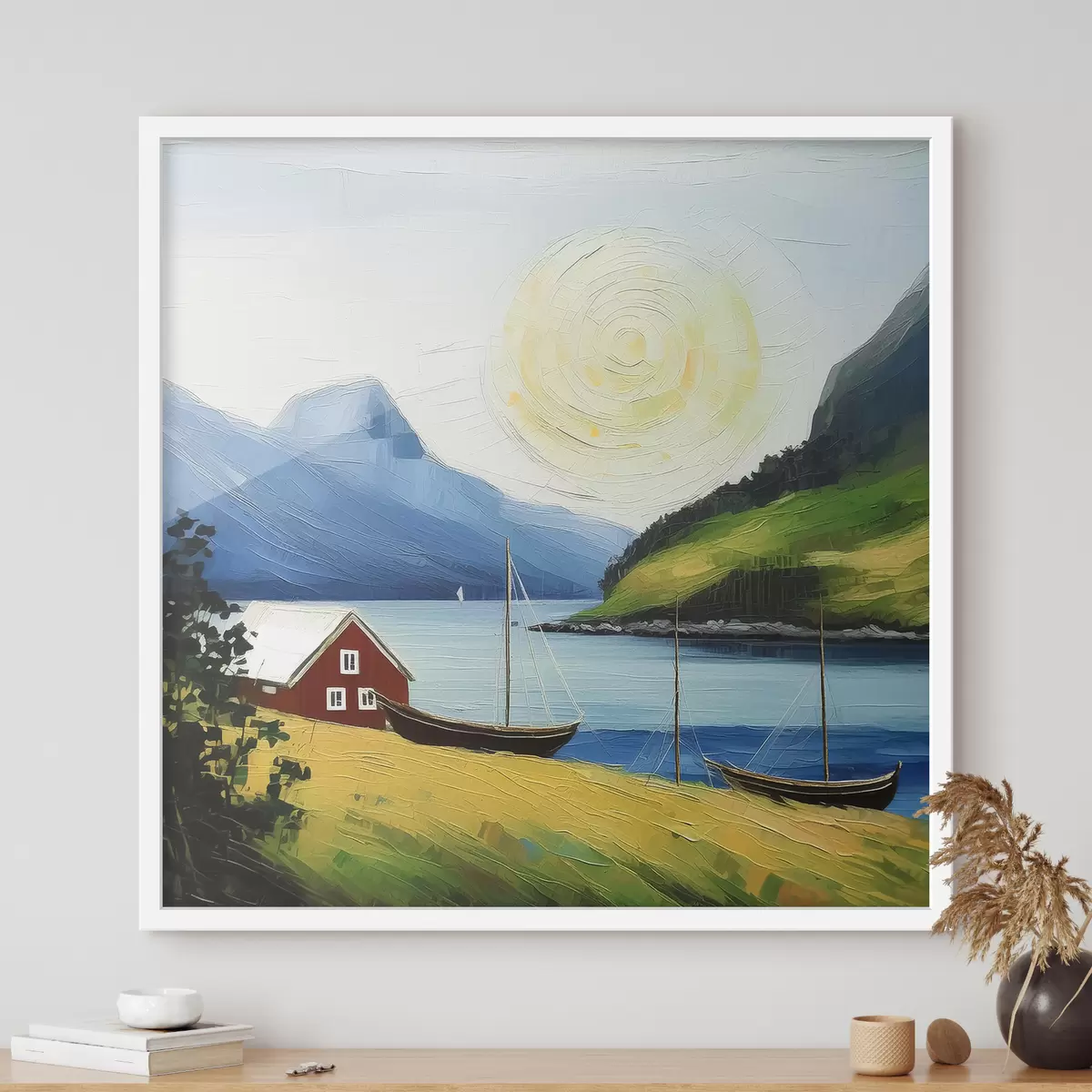 Plakatas Šiaurės šalių vasara, nedidelis namas ant jūros kranto, saulė mėlyname danguje, kalnai f39423