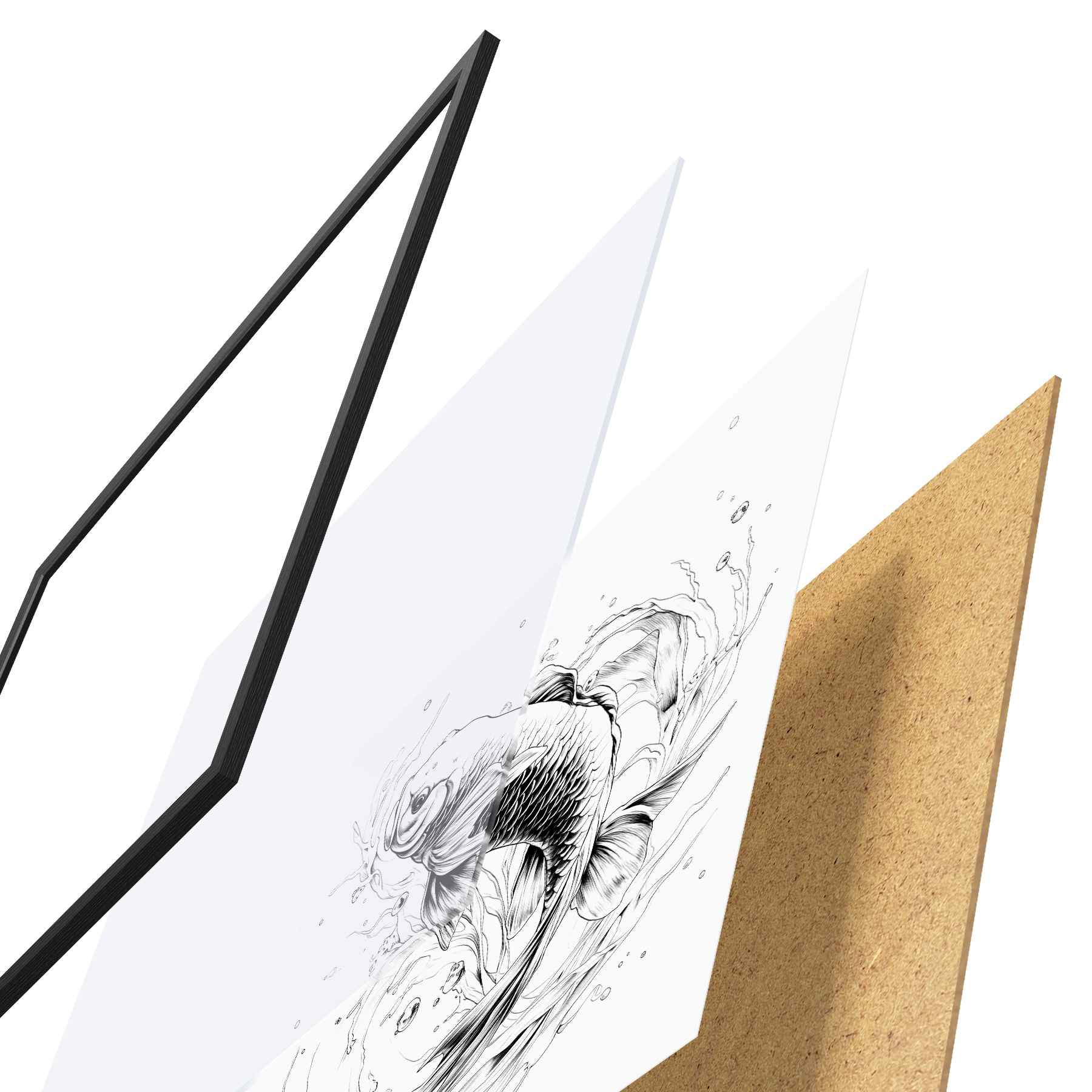 Plakatą sudaro rėmas, pleksiklas, atspausdintas vaizdas ir medžio drožlių plokštės pagrindas. Plakatą galima iš karto pakabinti ant sienos dėl kitoje pusėje esančių laikiklių.