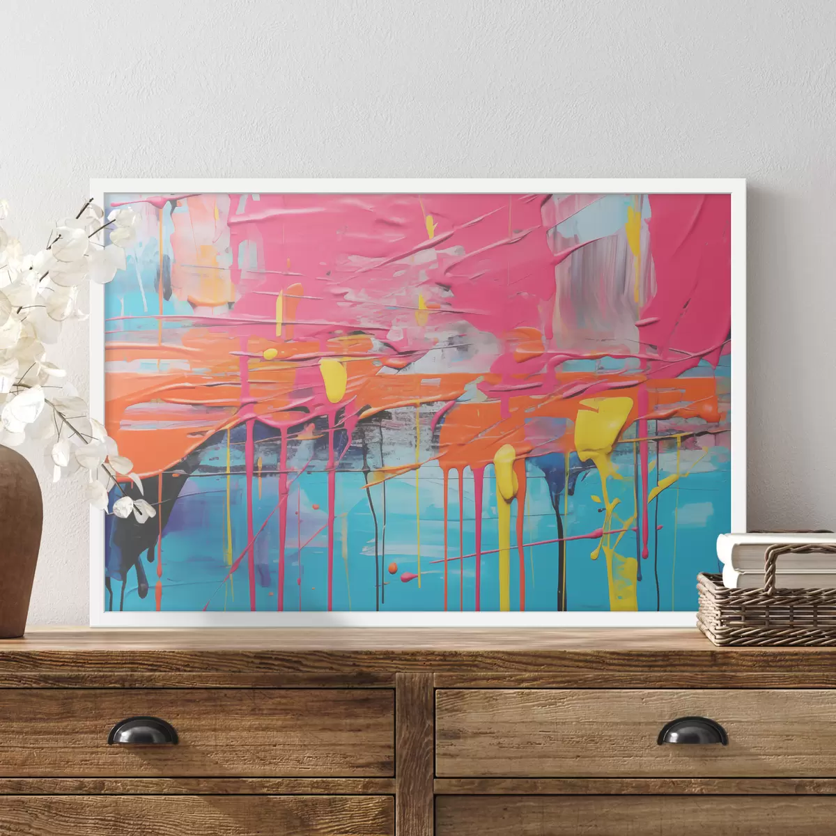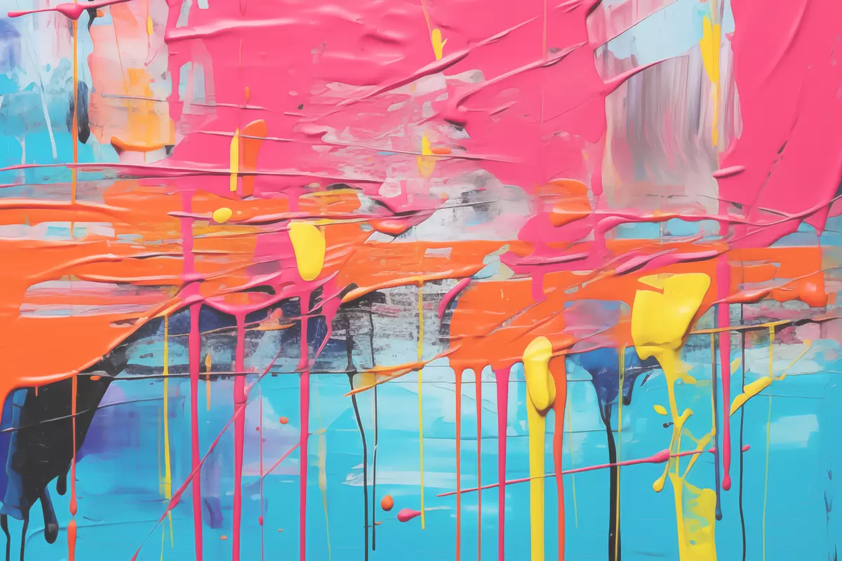 Plakatas Abstraktūs teptuko potėpiai ir aliejinės tapybos dėmės, rožinė, oranžinė, mėlyna, geltona spalva Ne f39437