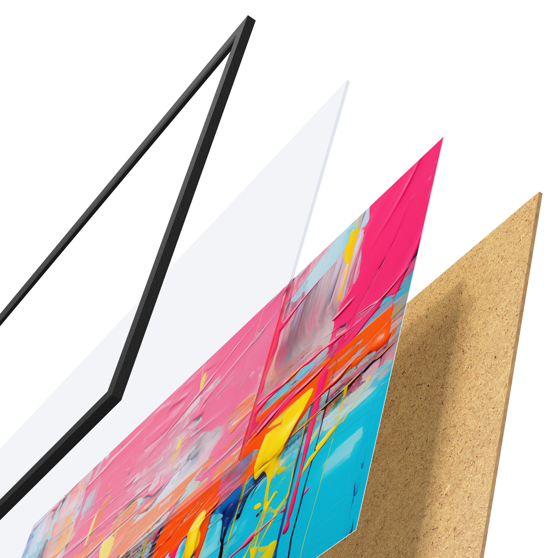 Plakatą sudaro rėmas, pleksiklas, atspausdintas vaizdas ir medžio drožlių plokštės pagrindas. Plakatą galima iš karto pakabinti ant sienos dėl kitoje pusėje esančių laikiklių.