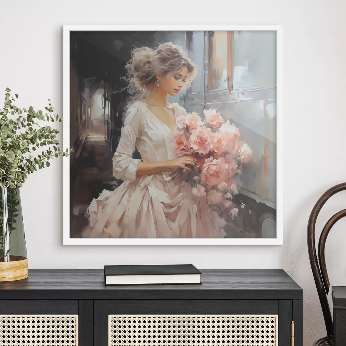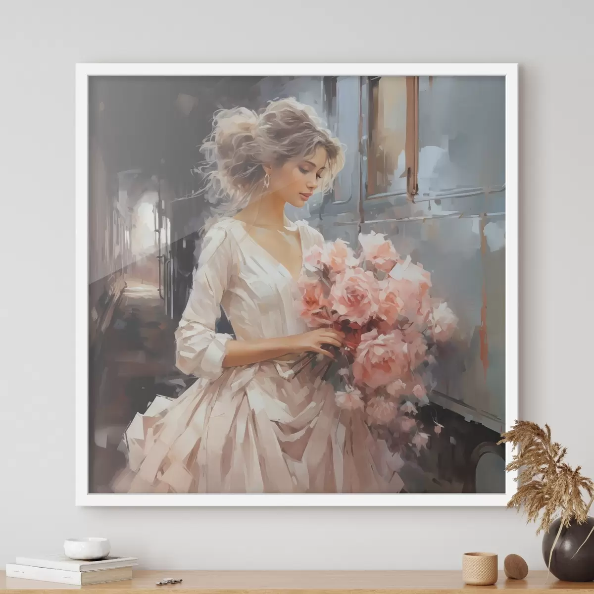 Plakatas Baltą suknelę vilkinti mergina stotyje rankose laiko rausvų rožių puokštę, aliejinė tapyba Ne f39438