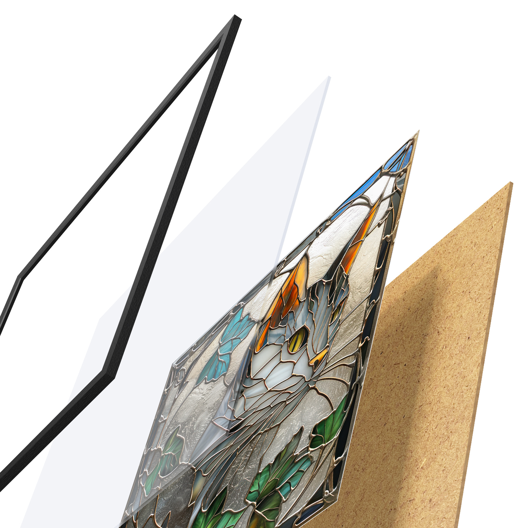 Plakatą sudaro rėmas, pleksiklas, atspausdintas vaizdas ir medžio drožlių plokštės pagrindas. Plakatą galima iš karto pakabinti ant sienos dėl kitoje pusėje esančių laikiklių.