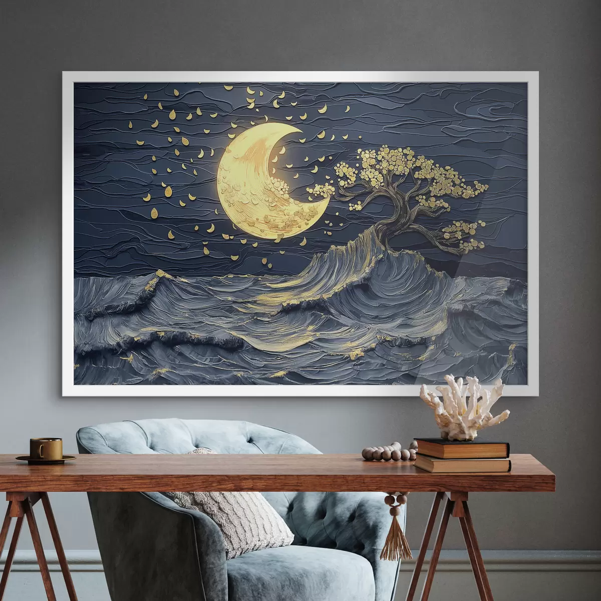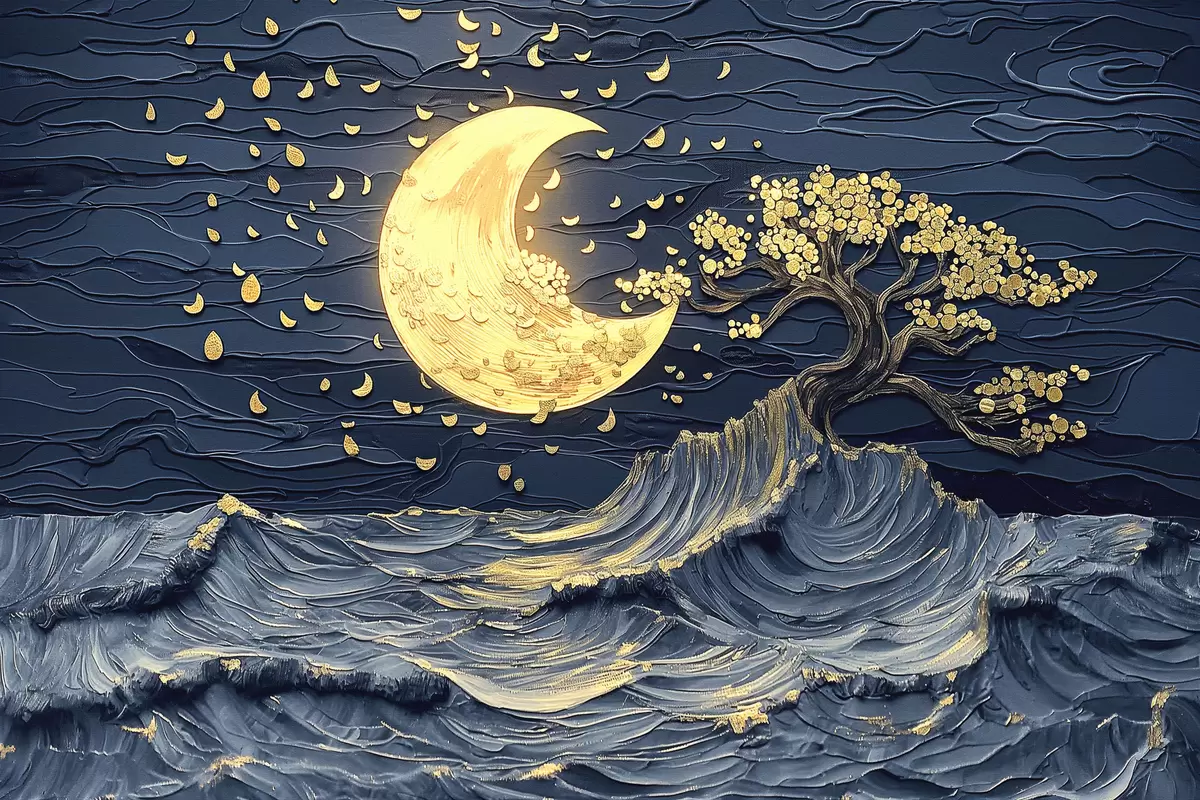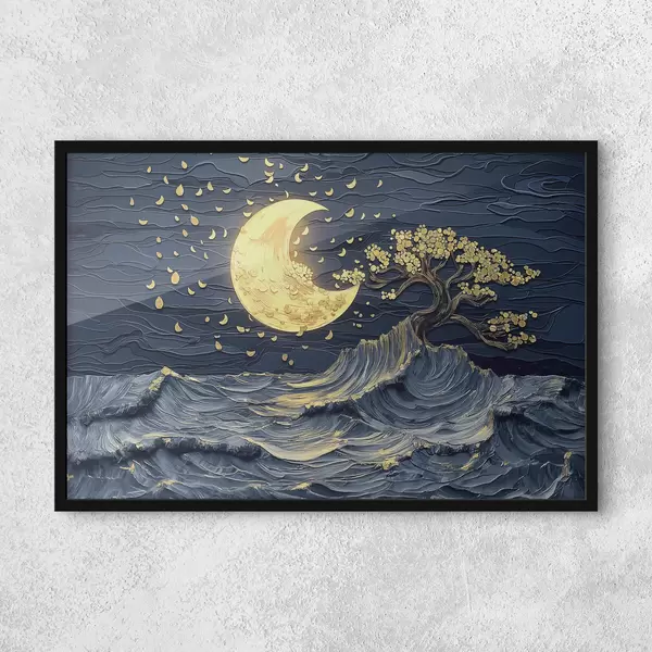 Plakatas Akrilo tapyba: romantiški jūros peizažai su nukritusiais lapais ir mėnulio šviesos atspindžiais f39449