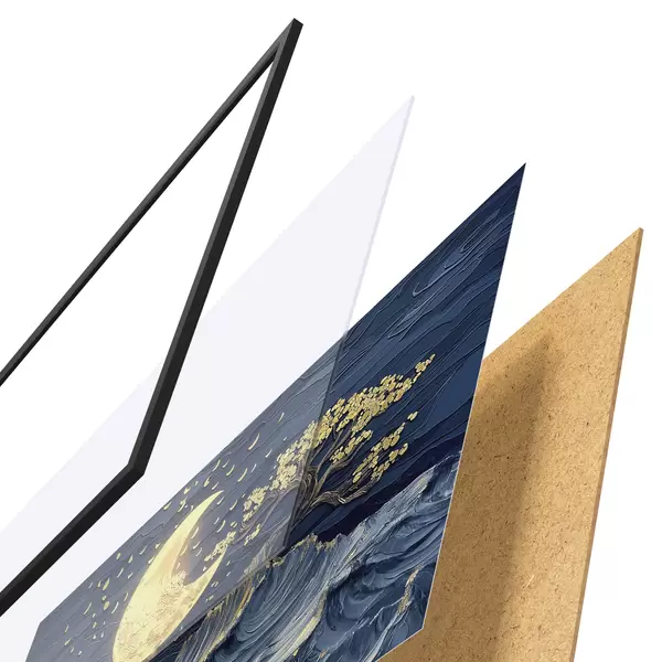 Plakatą sudaro rėmas, pleksiklas, atspausdintas vaizdas ir medžio drožlių plokštės pagrindas. Plakatą galima iš karto pakabinti ant sienos dėl kitoje pusėje esančių laikiklių.