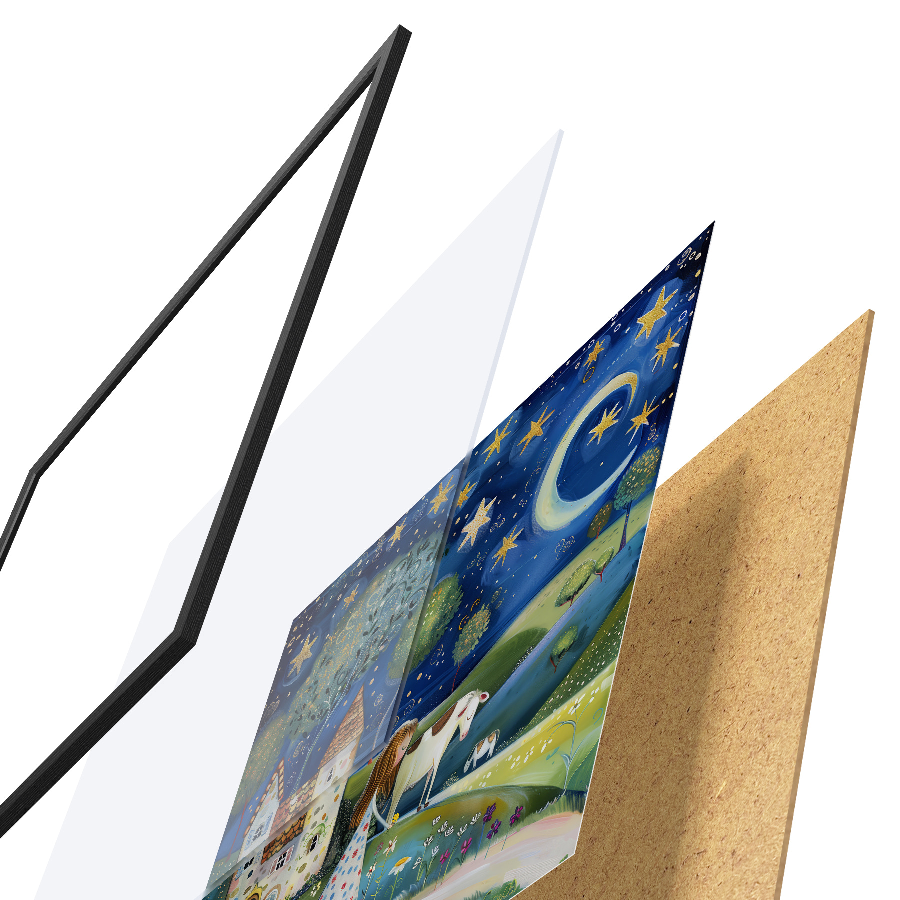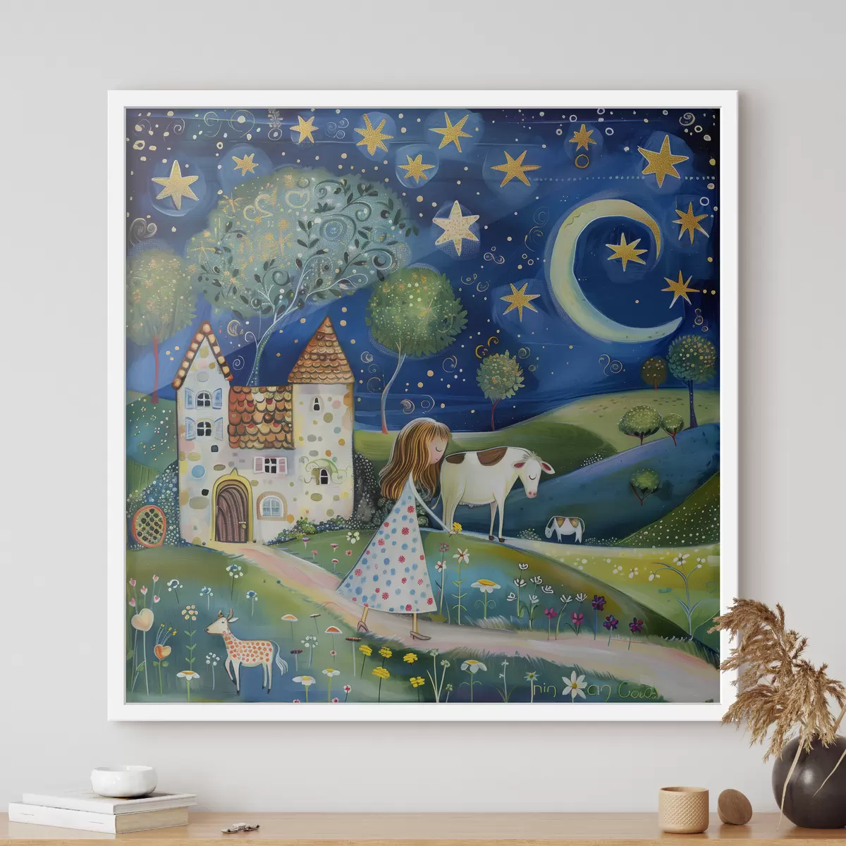 Plakatas Maža princesė, šuo, karvė ir fantazijos namas po žvaigždėmis įnoringu naivaus meno stiliumi f39451