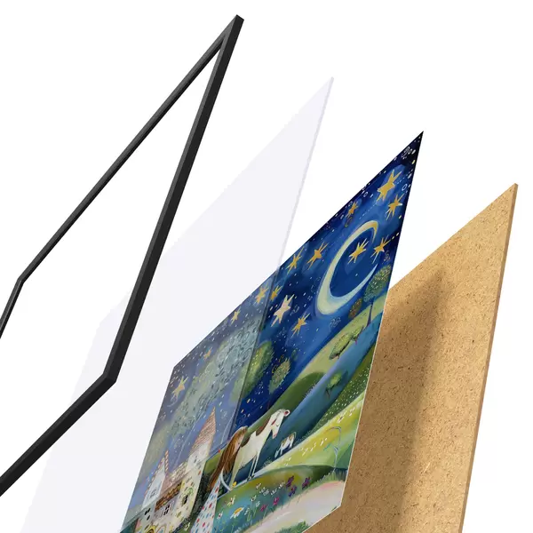 Plakatą sudaro rėmas, pleksiklas, atspausdintas vaizdas ir medžio drožlių plokštės pagrindas. Plakatą galima iš karto pakabinti ant sienos dėl kitoje pusėje esančių laikiklių.