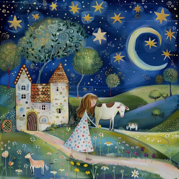 Plakatas Maža princesė, šuo, karvė ir fantazijos namas po žvaigždėmis įnoringu naivaus meno stiliumi f39451
