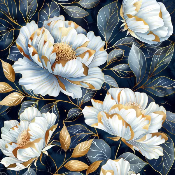 Plakatas Balti bijūnai ir rožės su kontūrais, mėlynais lapais ir gėlių raštais fone Ne f39457