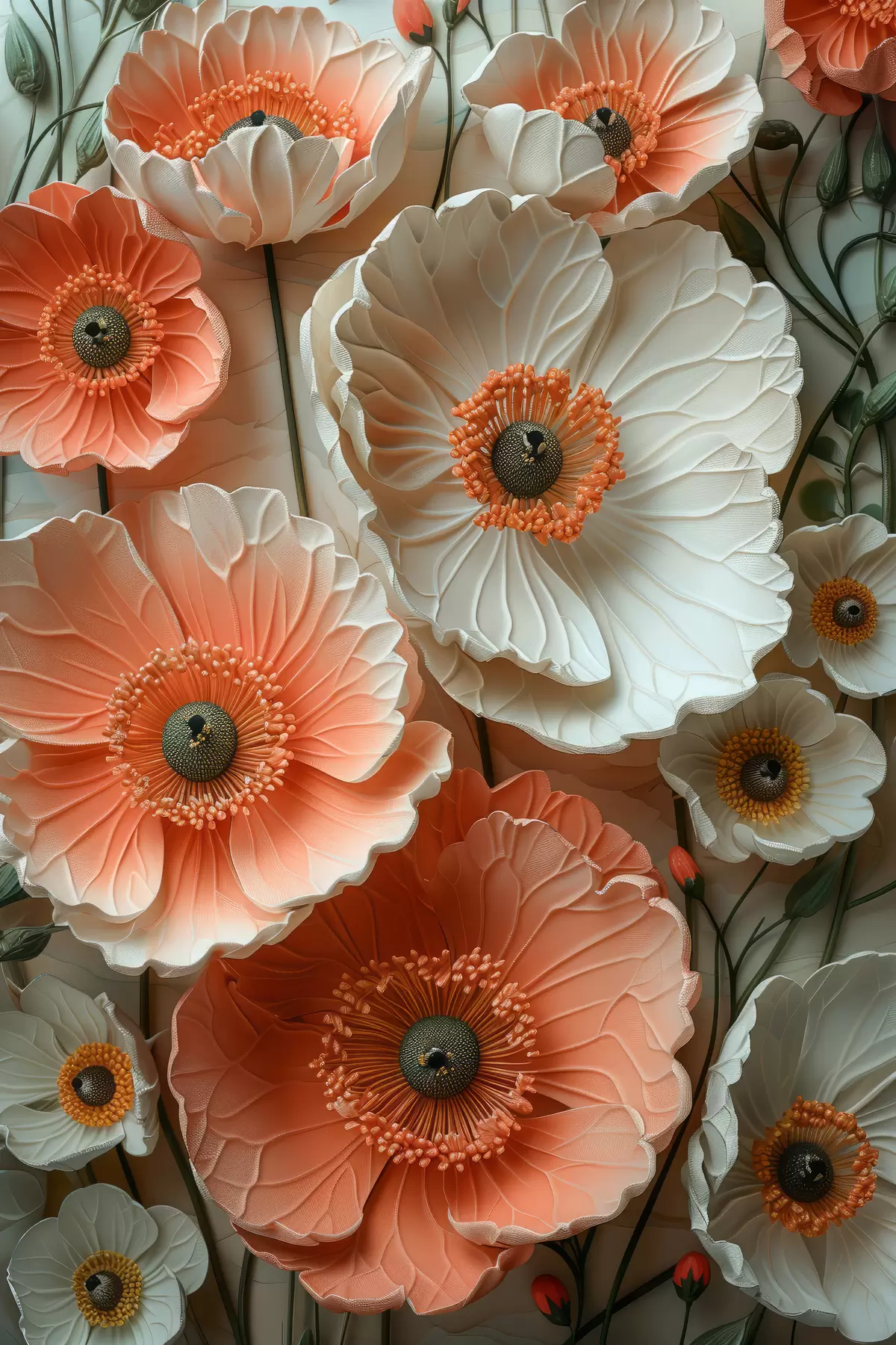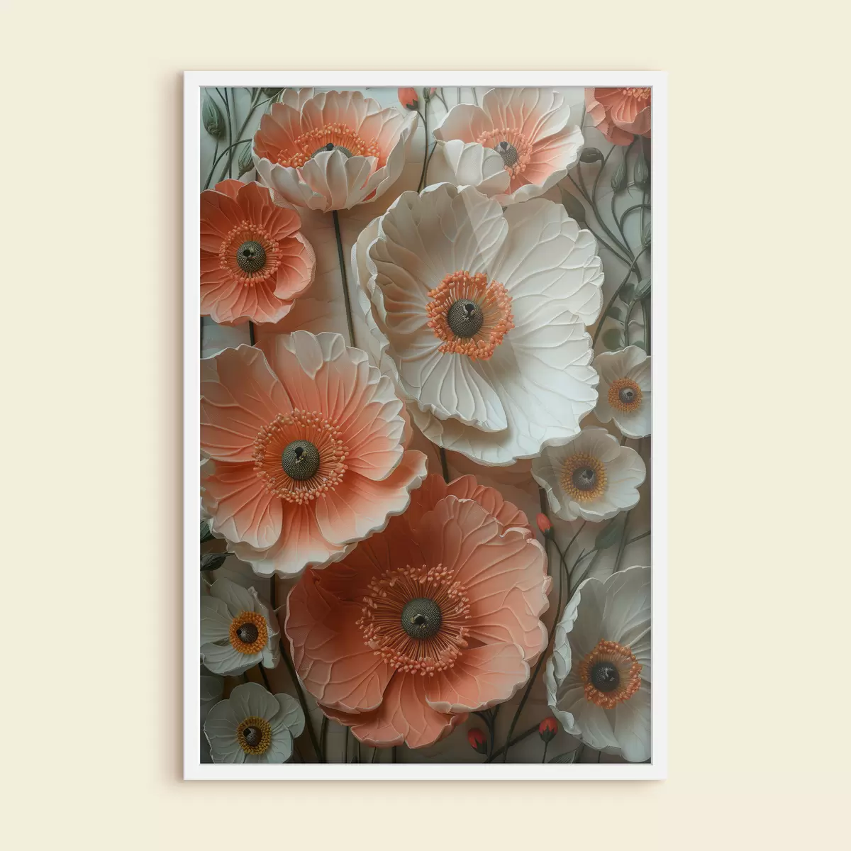 Plakatas Neutralios spalvos minkštos skulptūros stiliaus aguonos su šviesiai rožiniais ir šviesiai oranžiniais žiedpumpuriais f39466