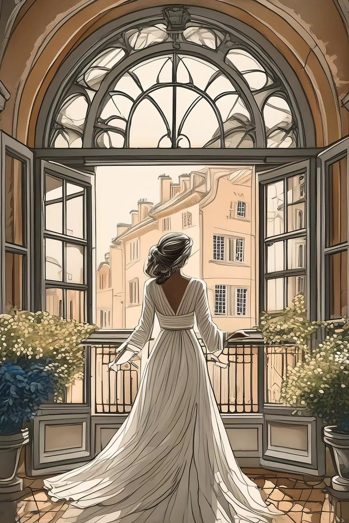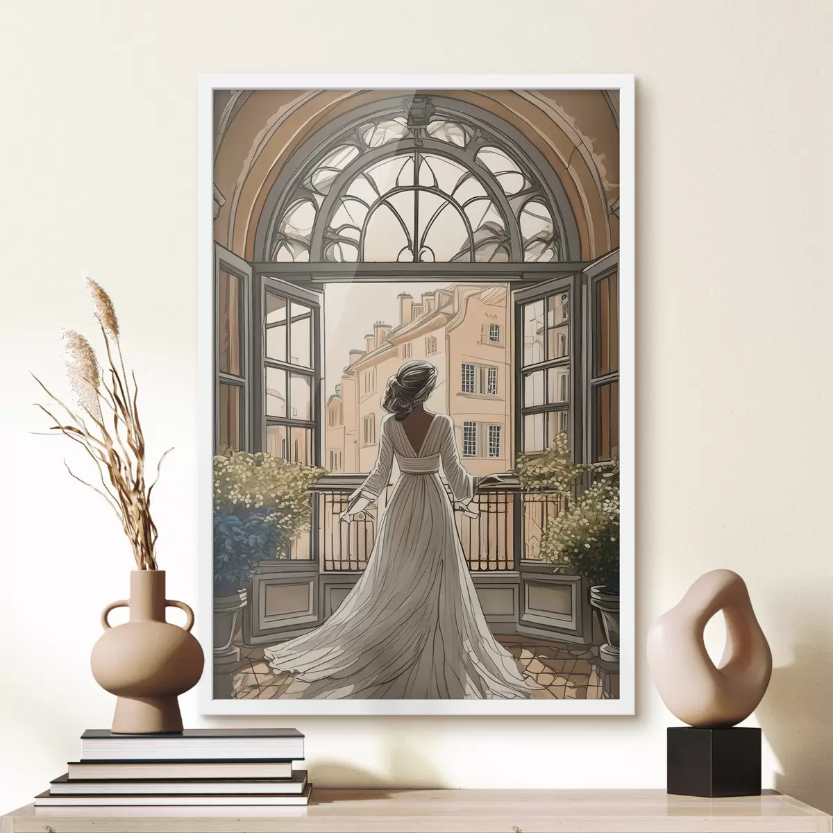 Plakatas merginos balta suknele siluetas prie didelio lango f39480