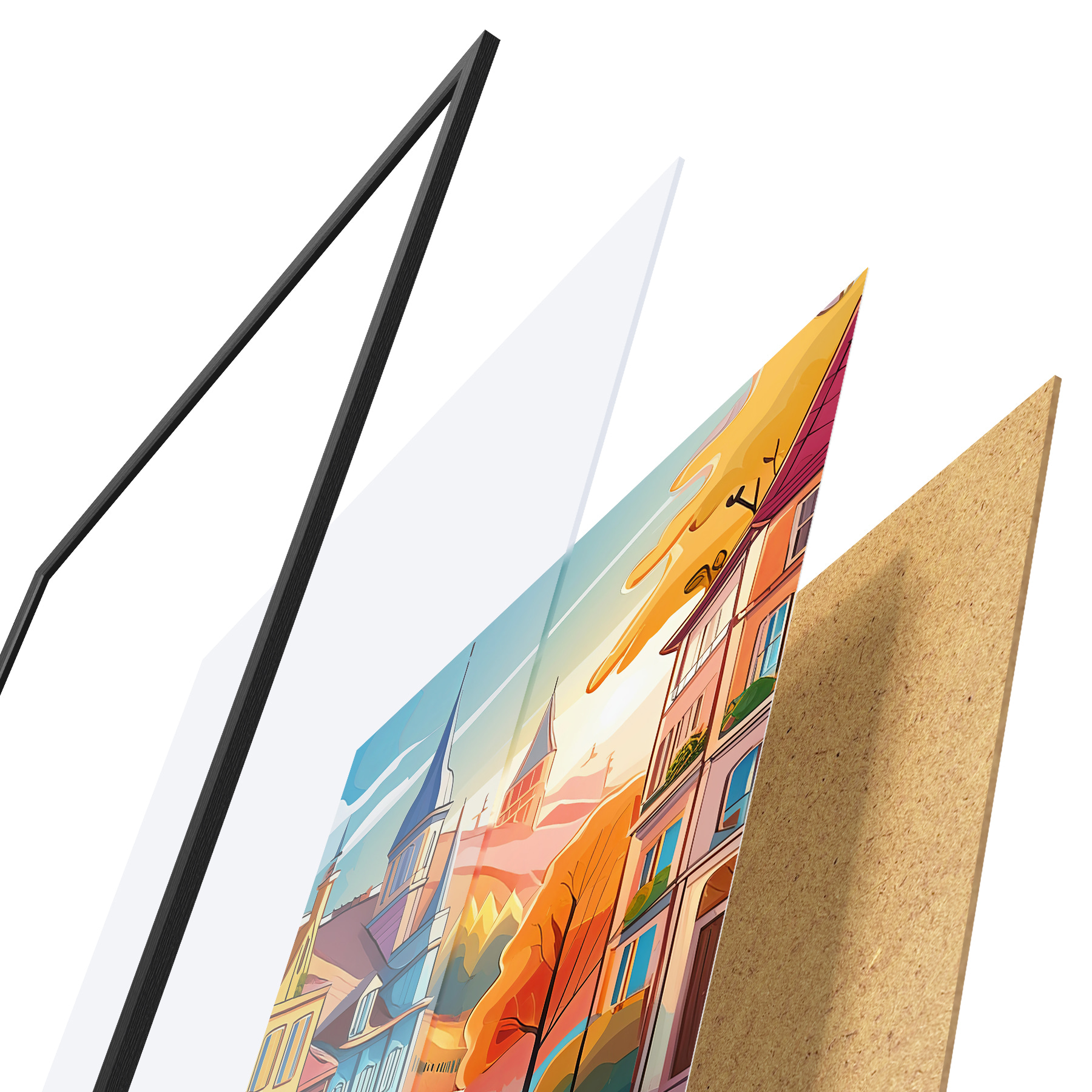 Plakatą sudaro rėmas, pleksiklas, atspausdintas vaizdas ir medžio drožlių plokštės pagrindas. Plakatą galima iš karto pakabinti ant sienos dėl kitoje pusėje esančių laikiklių.