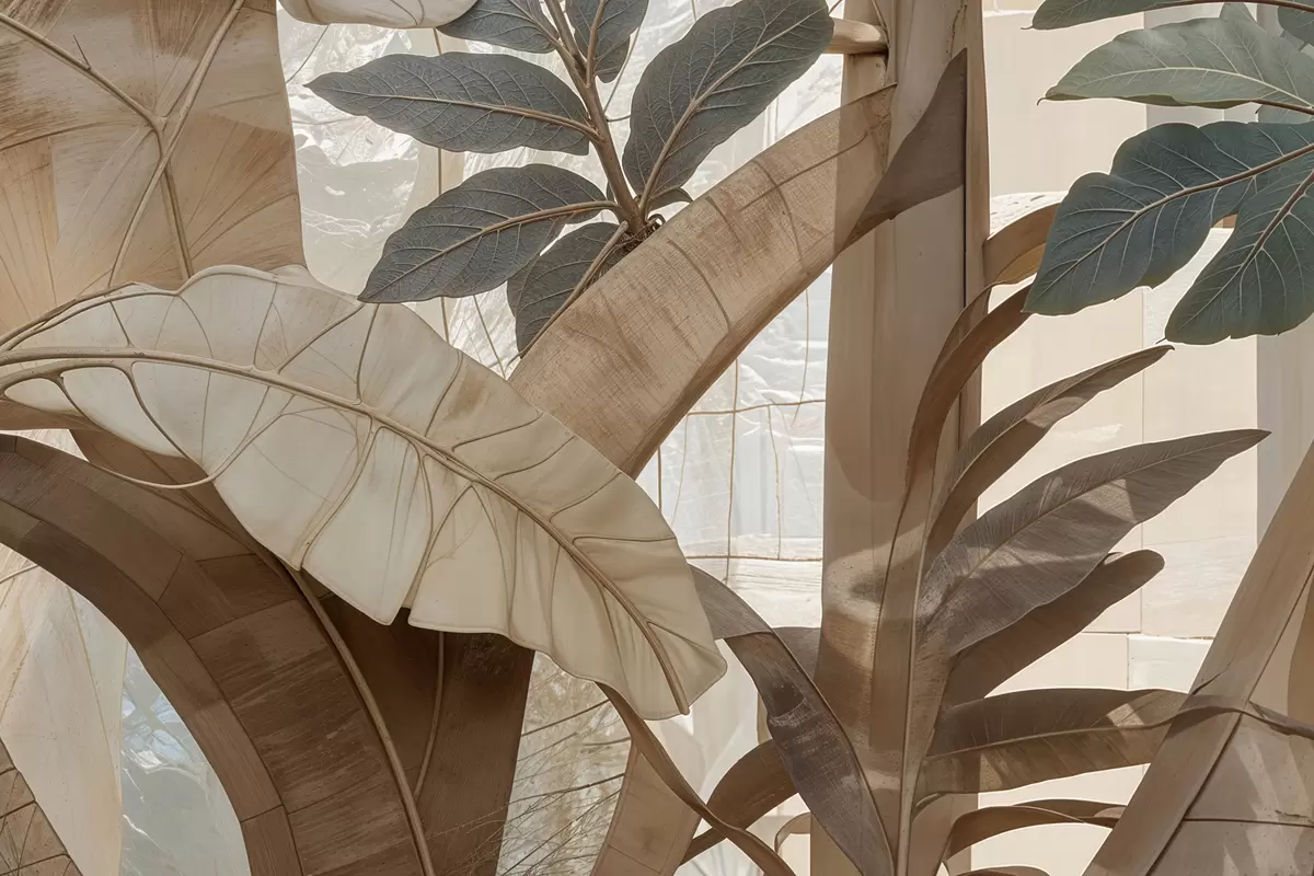 Plakatas Atogrąžų lapų rašto vaizdas iš arti su įvairiais atspalviais, sukuriantis abstraktų ir tekstūruotą dizainą f39497