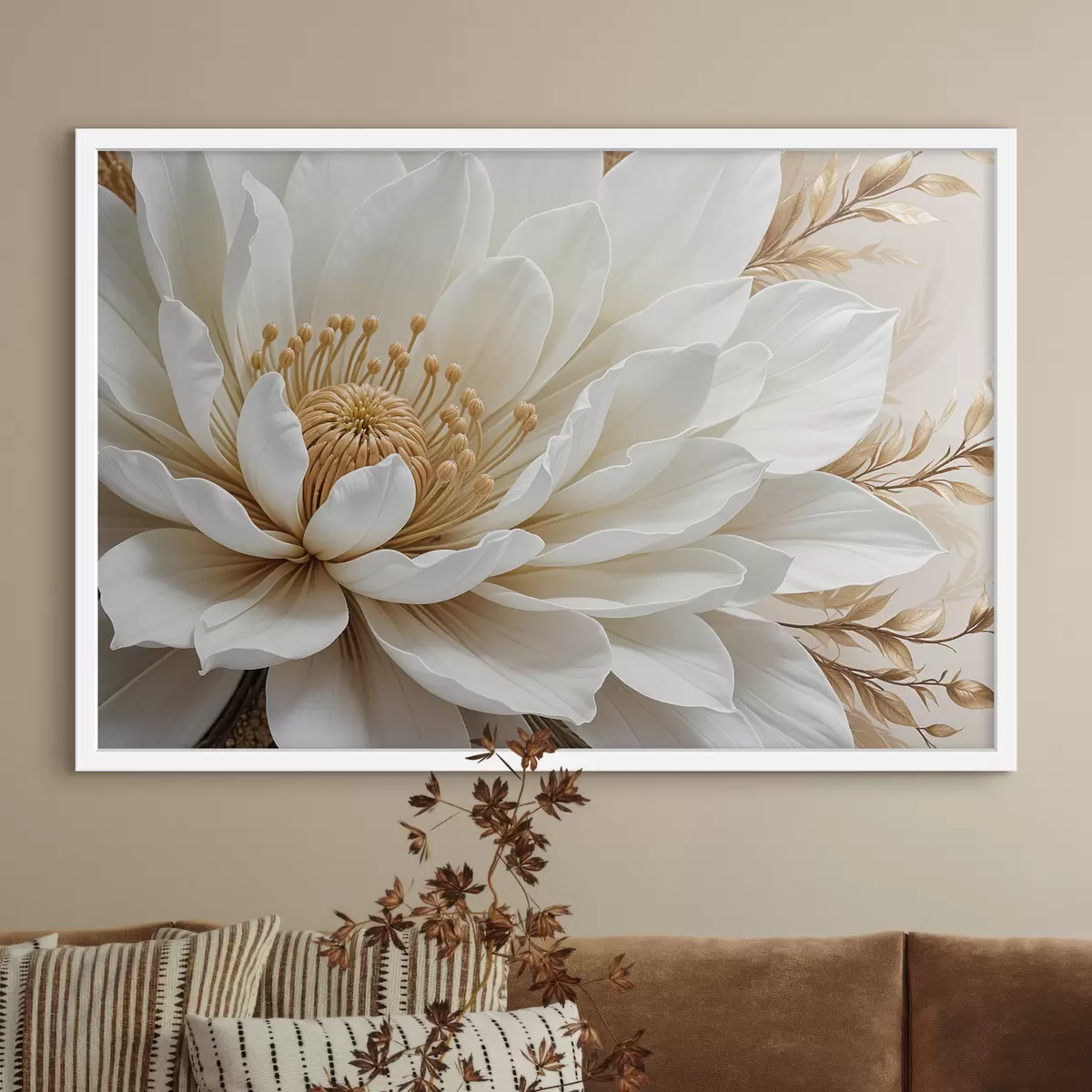 Plakatas Didelės, baltos jurginų gėlės su švelniais žiedlapiais ir ryškiu geltonu centru stambiu planu f39508