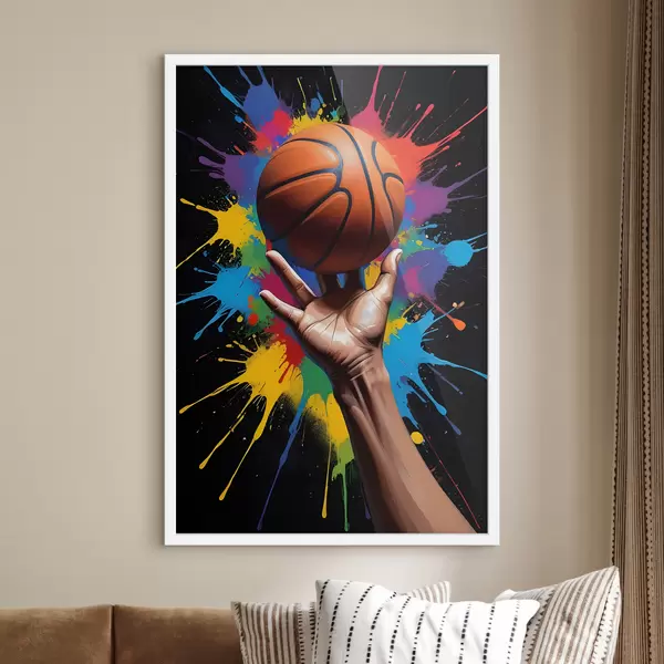 Plakatas Ranka, laikanti krepšinio kamuolį spalvingame dažų taškymo fone f39529