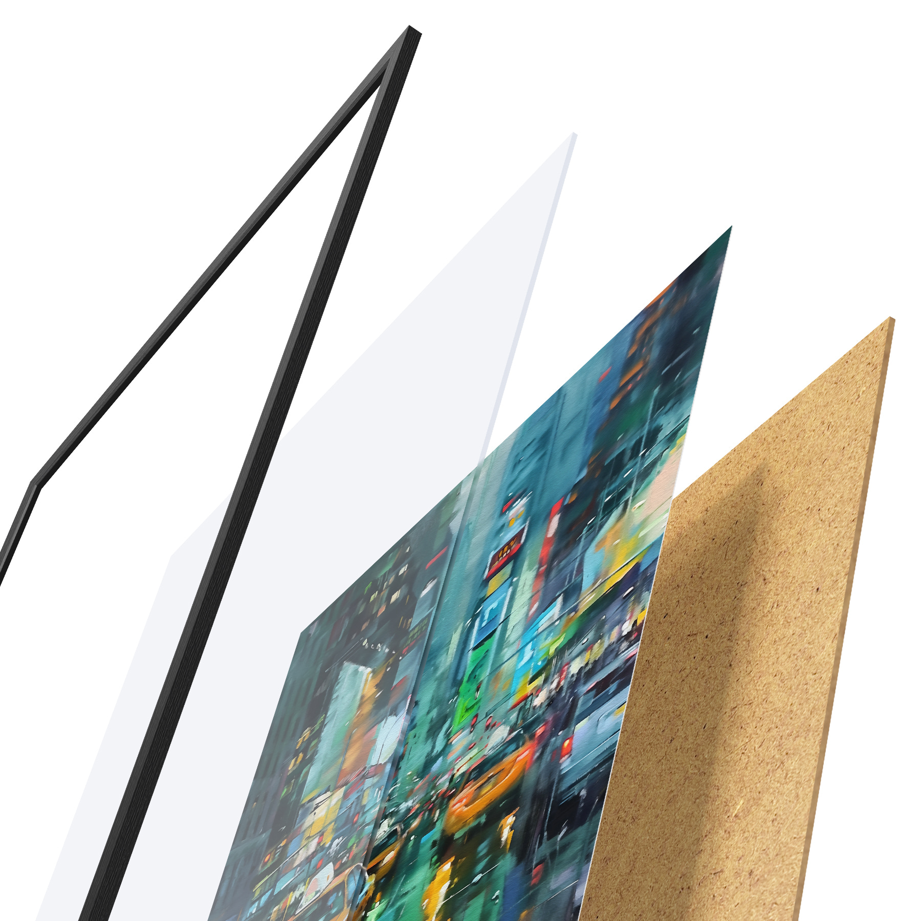 Plakatą sudaro rėmas, pleksiklas, atspausdintas vaizdas ir medžio drožlių plokštės pagrindas. Plakatą galima iš karto pakabinti ant sienos dėl kitoje pusėje esančių laikiklių.