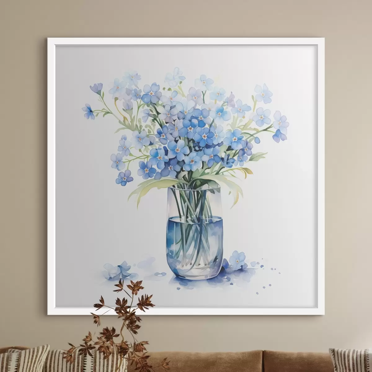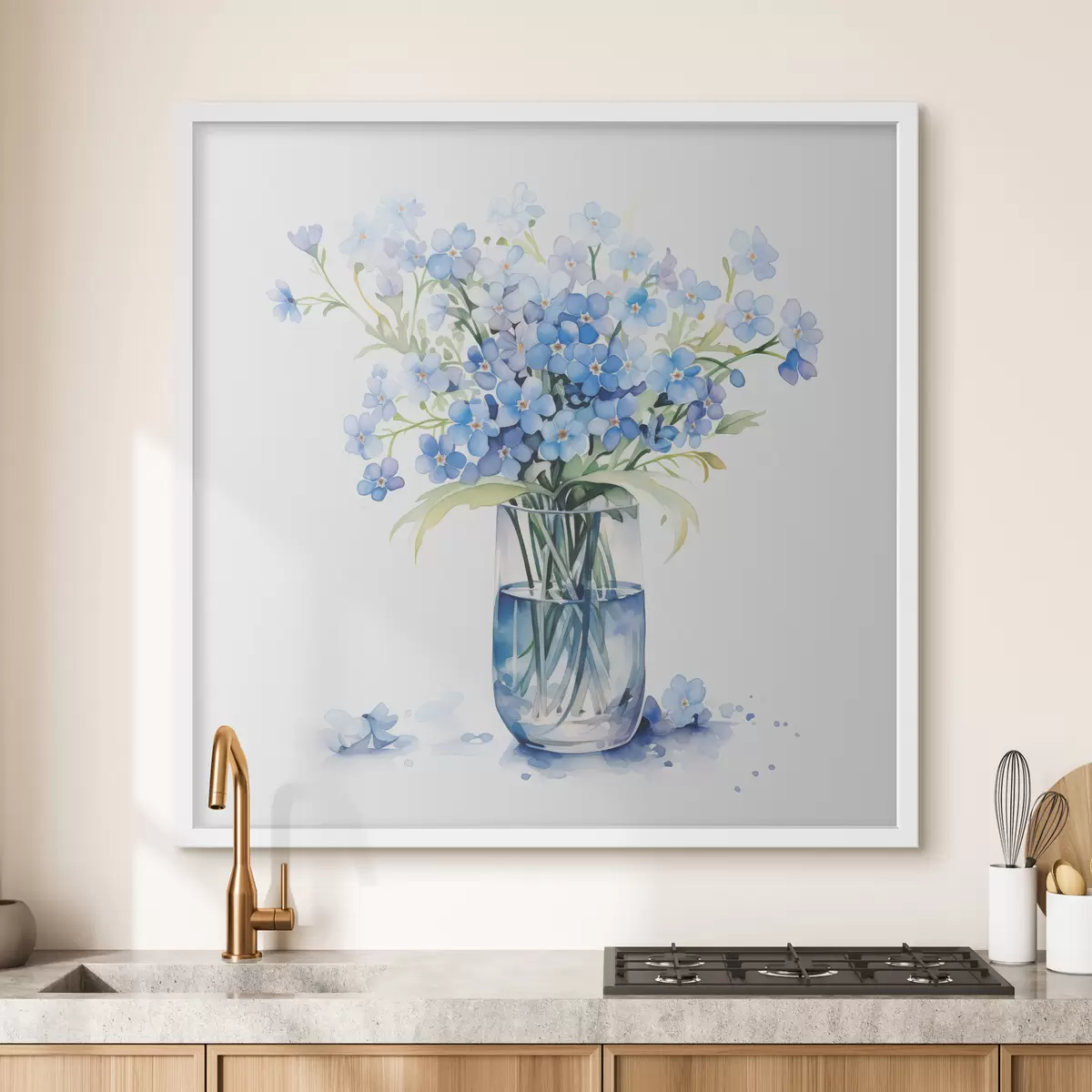 Plakatas Mėlynų gėlių puokštė skaidrioje akvarelėje vazoje f39564