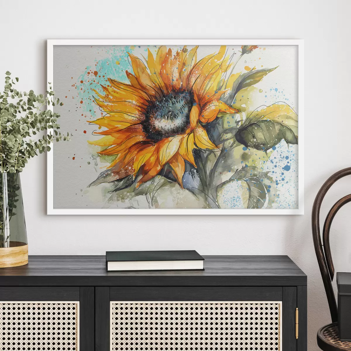 Plakatas Akvarelinė saulėgrąža su dažų purslais f39583