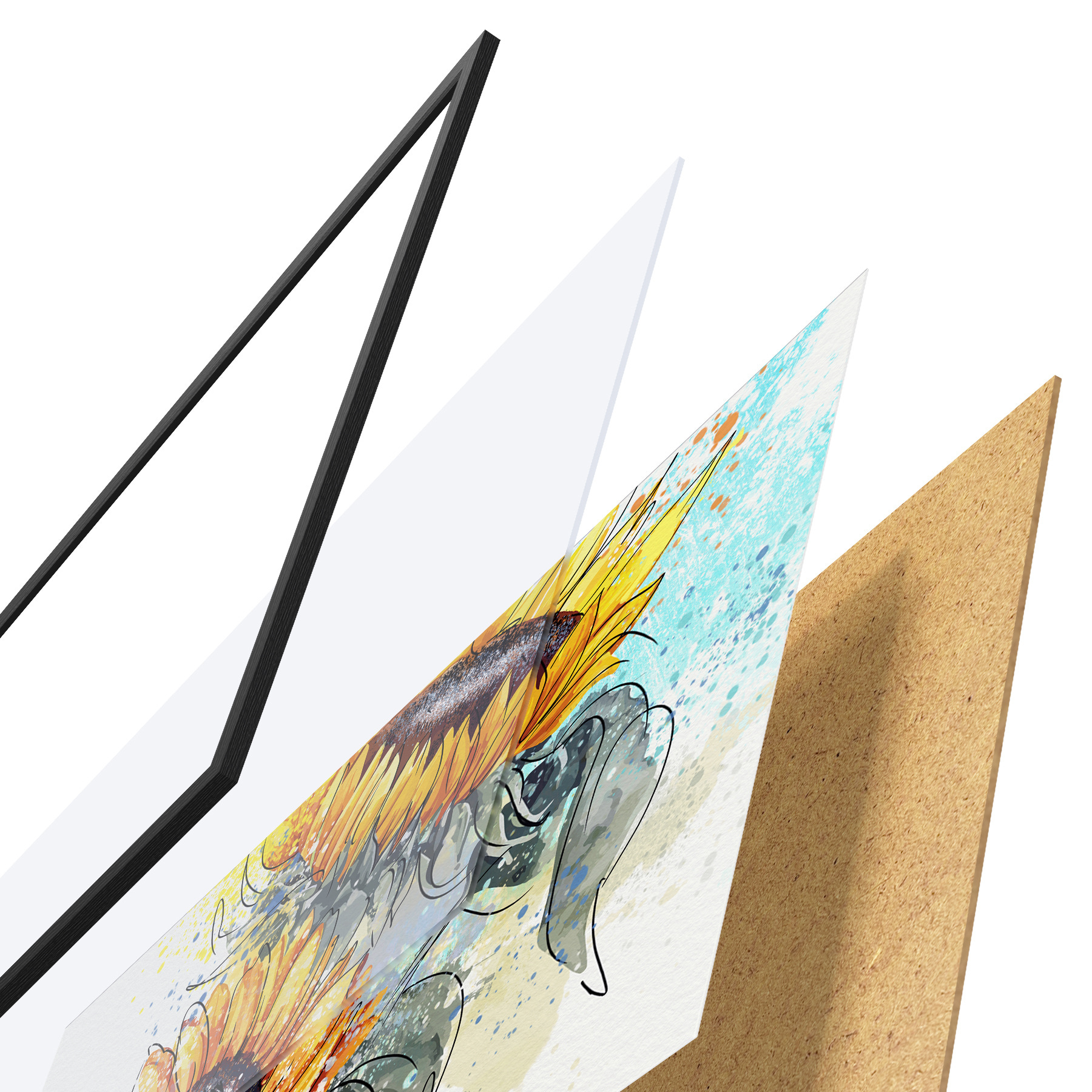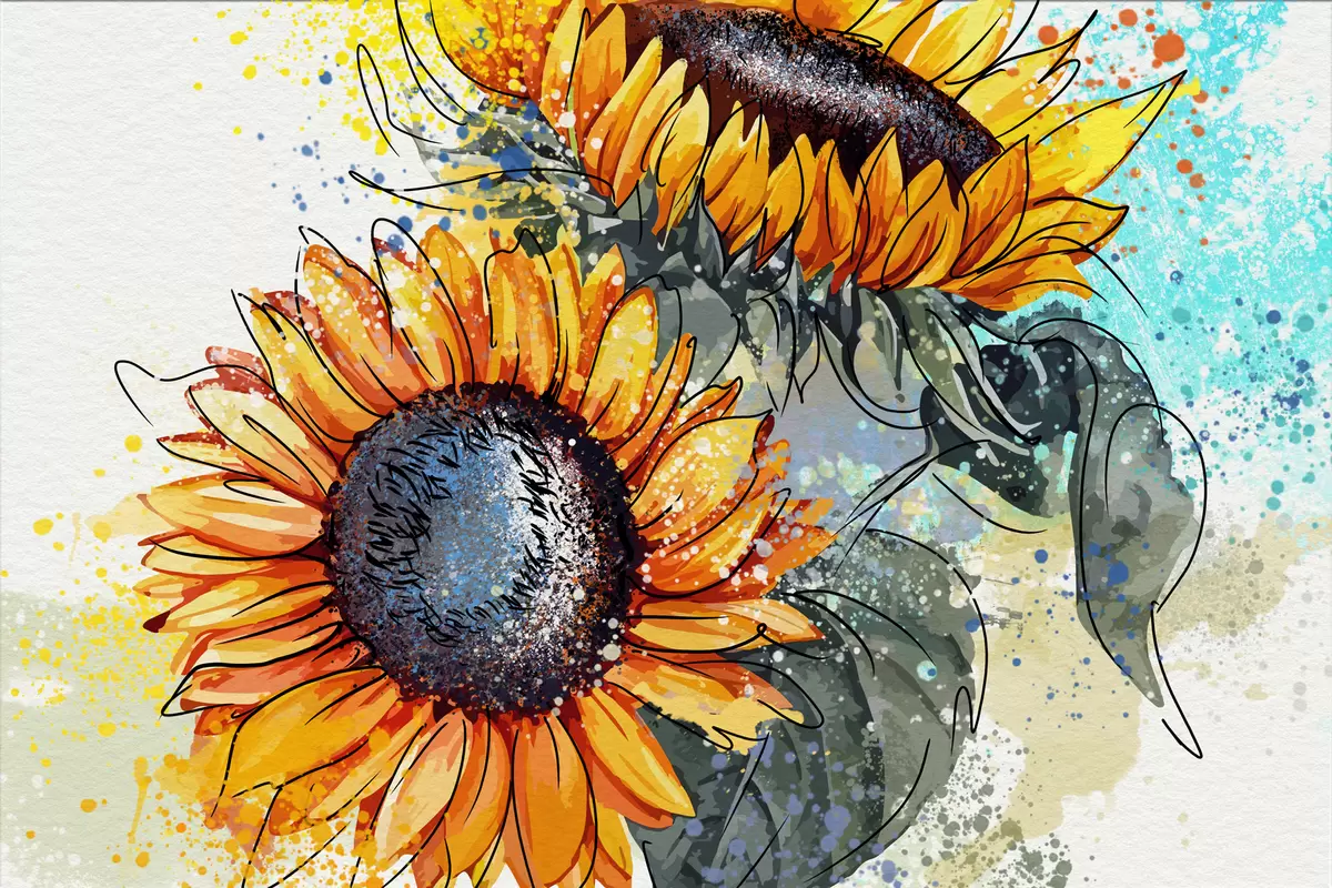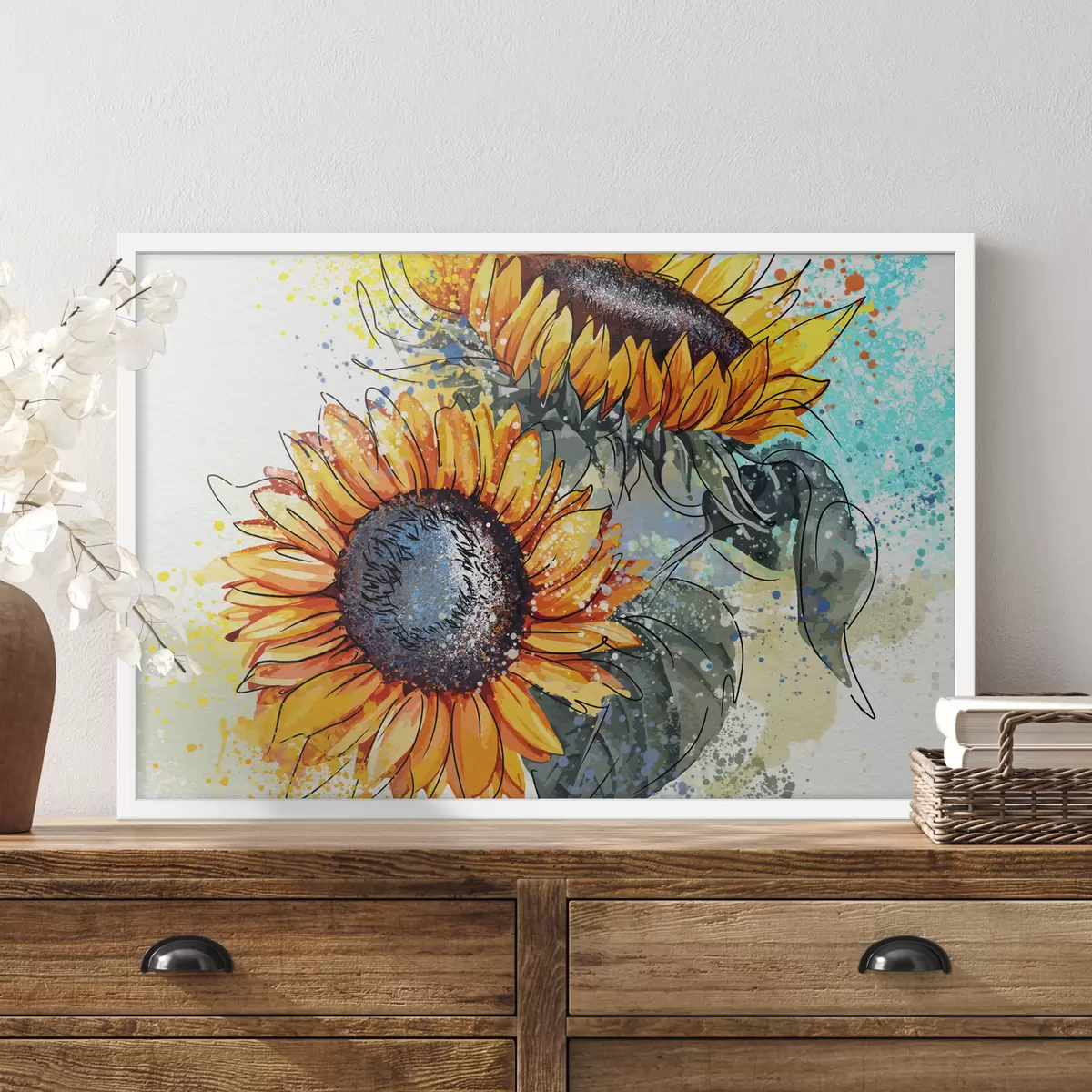Plakatas Ryškios saulėgrąžos, akvarelės efektas su dažų purslais f39585