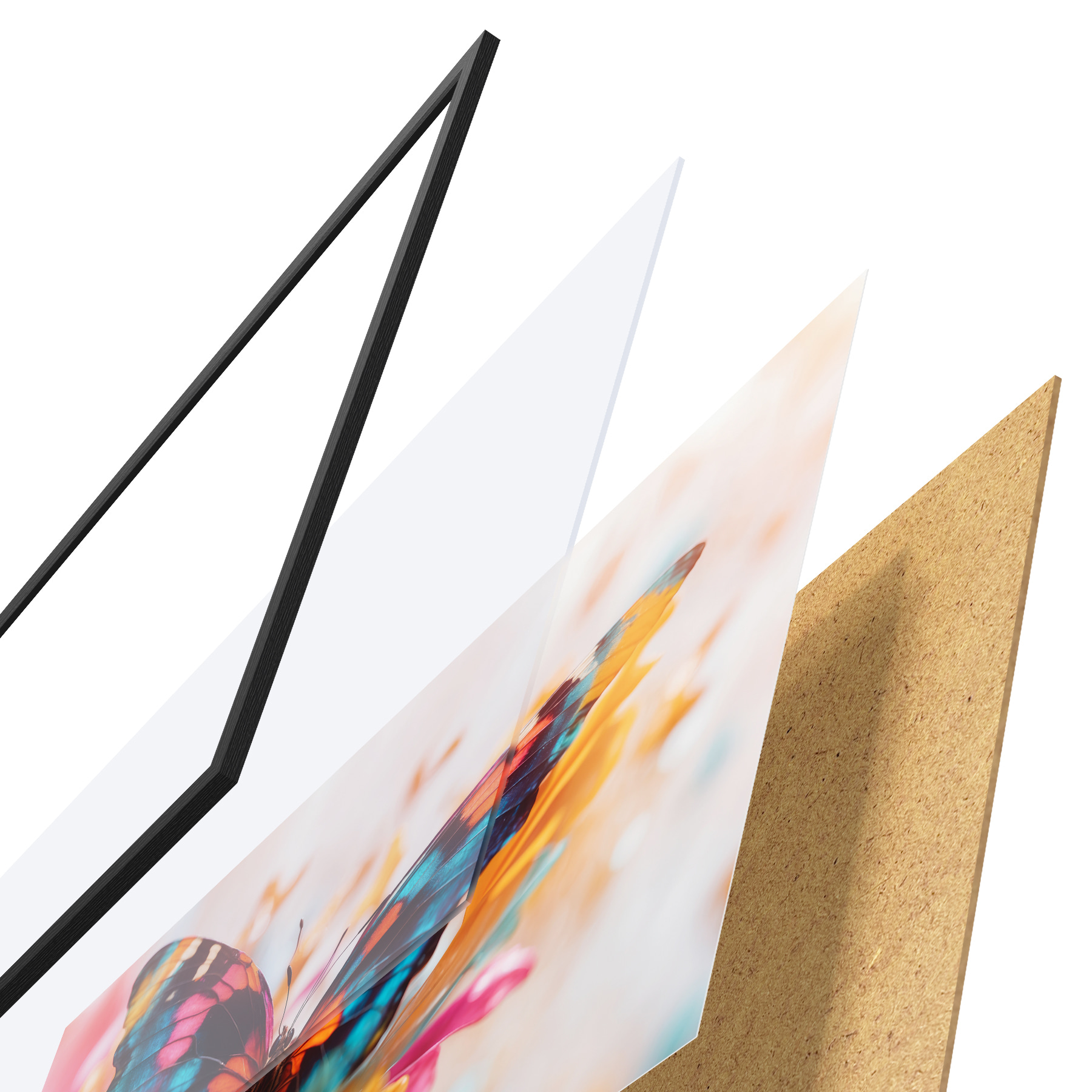 Plakatą sudaro rėmas, pleksiklas, atspausdintas vaizdas ir medžio drožlių plokštės pagrindas. Plakatą galima iš karto pakabinti ant sienos dėl kitoje pusėje esančių laikiklių.