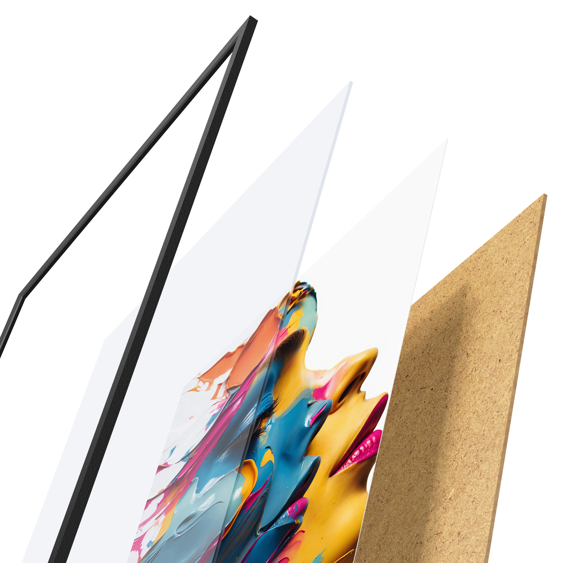 Plakatą sudaro rėmas, pleksiklas, atspausdintas vaizdas ir medžio drožlių plokštės pagrindas. Plakatą galima iš karto pakabinti ant sienos dėl kitoje pusėje esančių laikiklių.