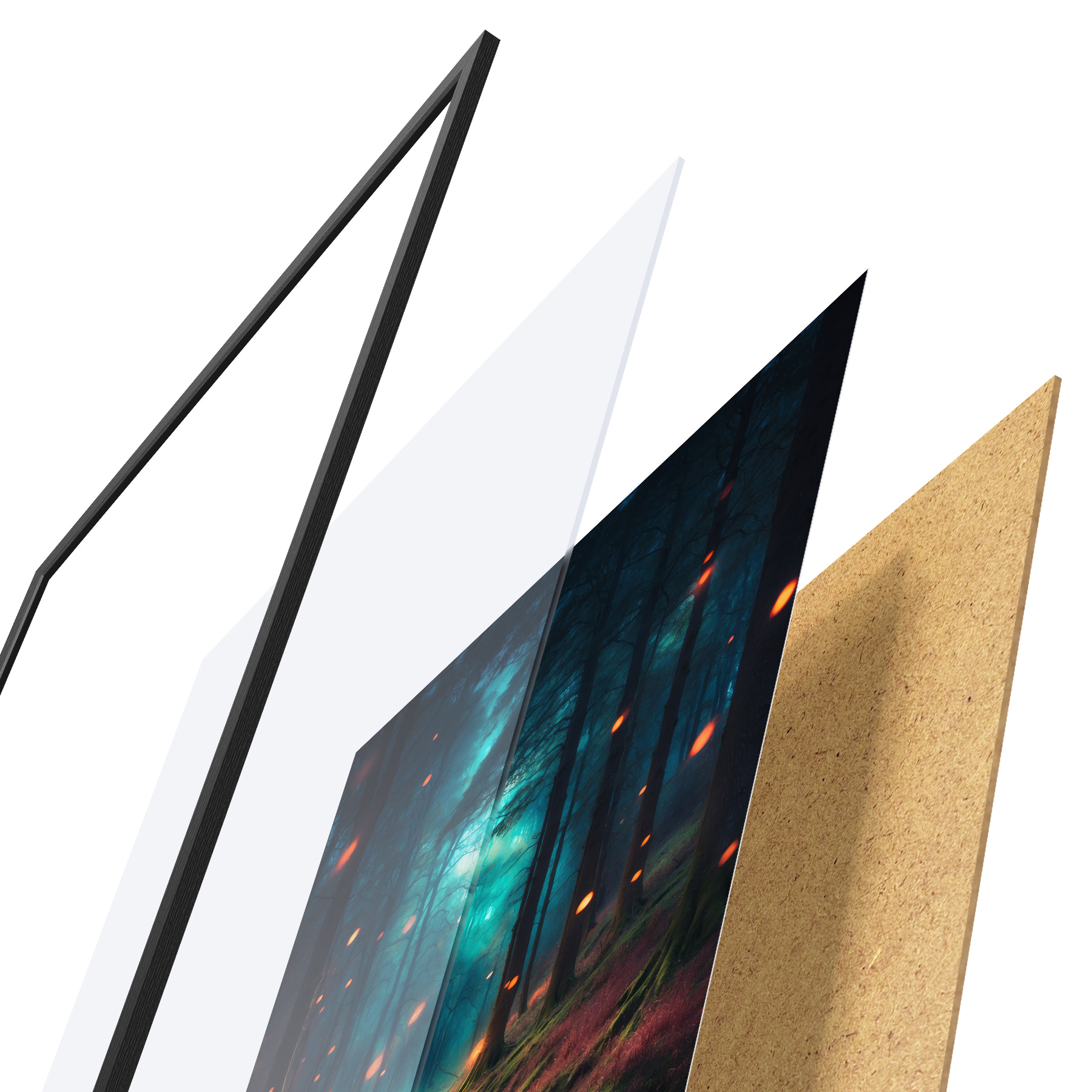 Plakatą sudaro rėmas, pleksiklas, atspausdintas vaizdas ir medžio drožlių plokštės pagrindas. Plakatą galima iš karto pakabinti ant sienos dėl kitoje pusėje esančių laikiklių.