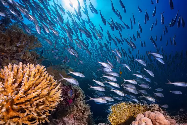 Plakatas daug mažų žuvų prie koralų Ne f39625