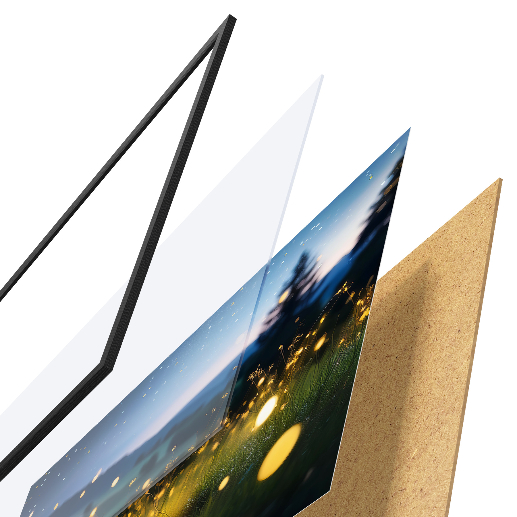 Plakatą sudaro rėmas, pleksiklas, atspausdintas vaizdas ir medžio drožlių plokštės pagrindas. Plakatą galima iš karto pakabinti ant sienos dėl kitoje pusėje esančių laikiklių.