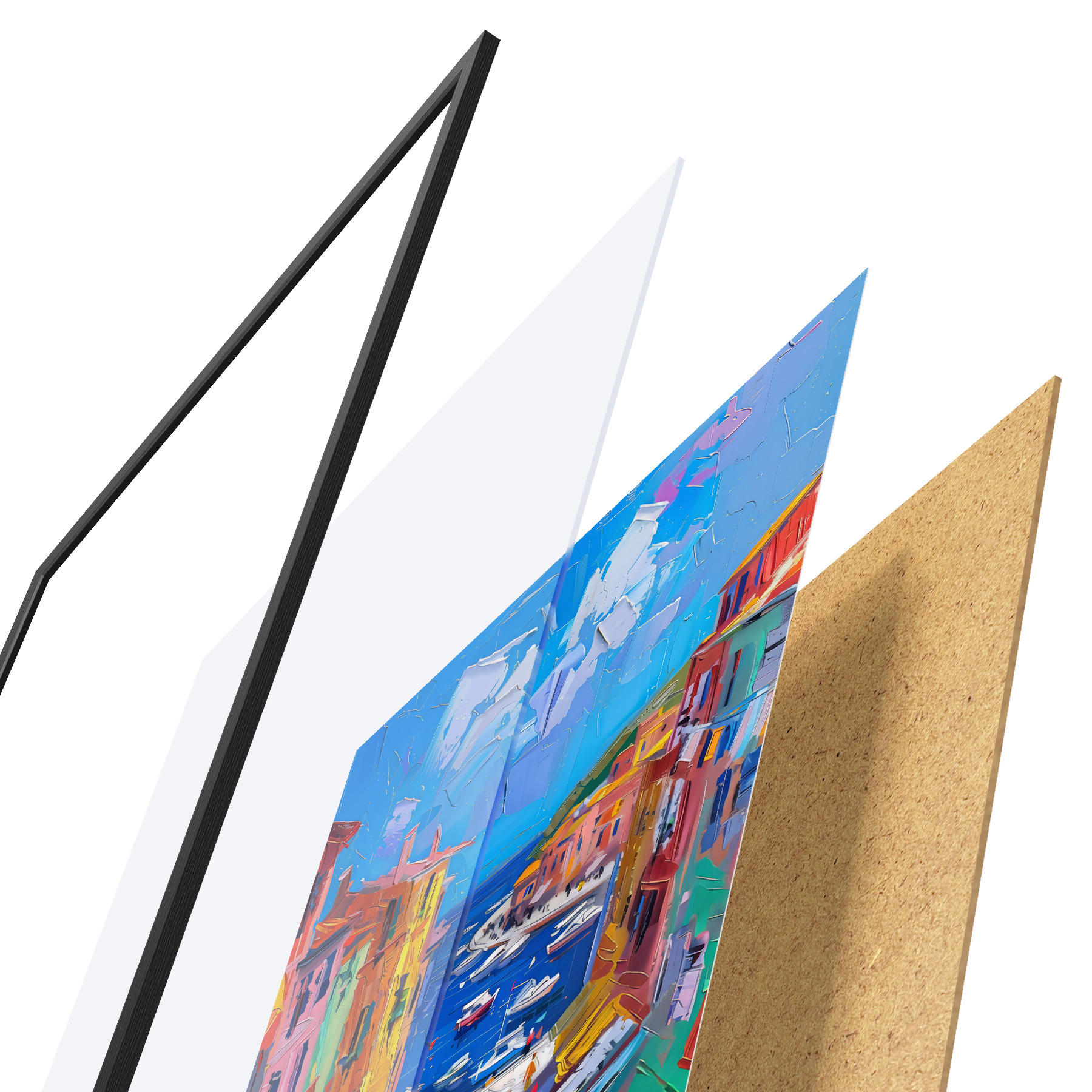 Plakatą sudaro rėmas, pleksiklas, atspausdintas vaizdas ir medžio drožlių plokštės pagrindas. Plakatą galima iš karto pakabinti ant sienos dėl kitoje pusėje esančių laikiklių.