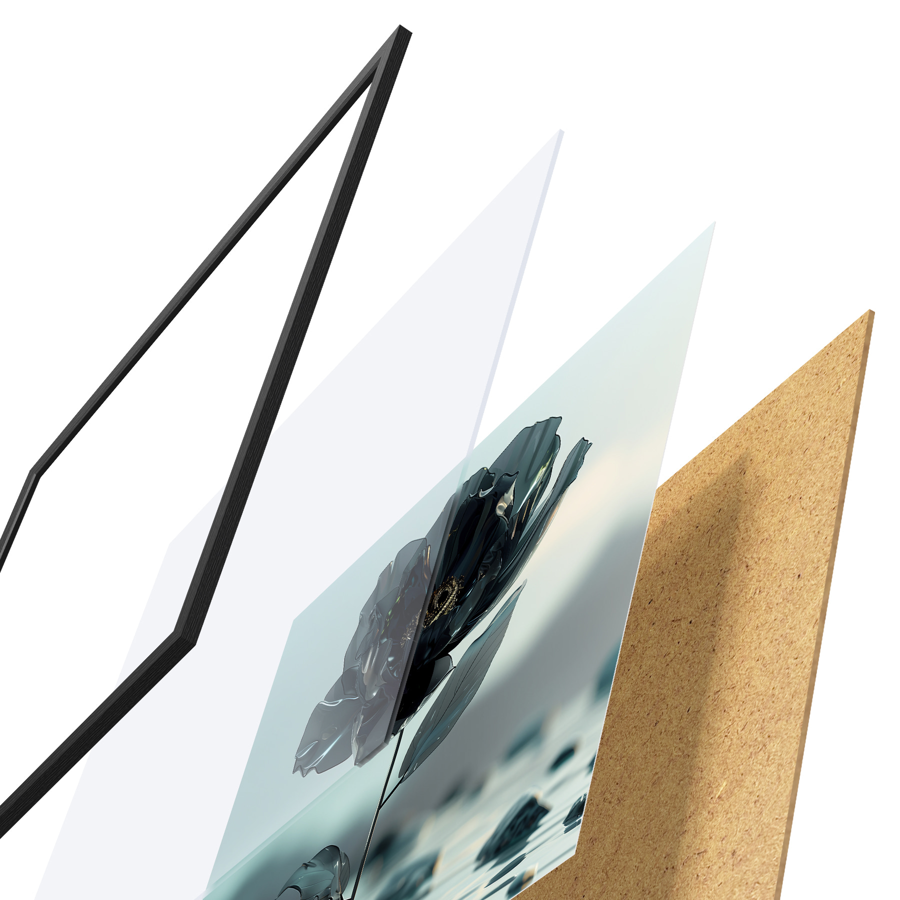 Plakatą sudaro rėmas, pleksiklas, atspausdintas vaizdas ir medžio drožlių plokštės pagrindas. Plakatą galima iš karto pakabinti ant sienos dėl kitoje pusėje esančių laikiklių.