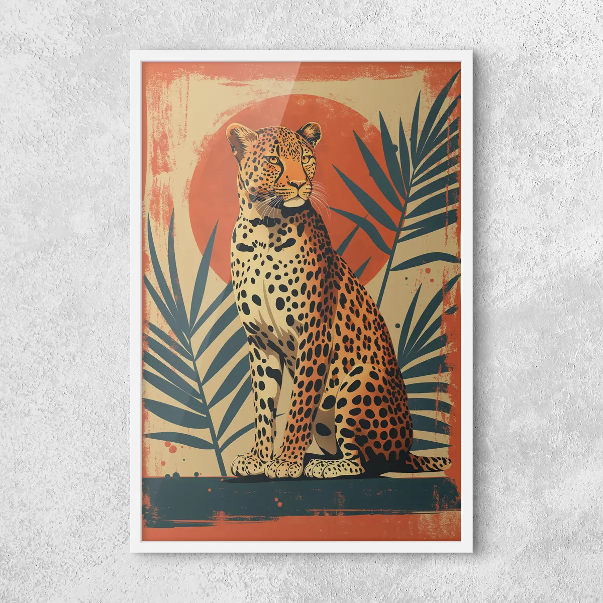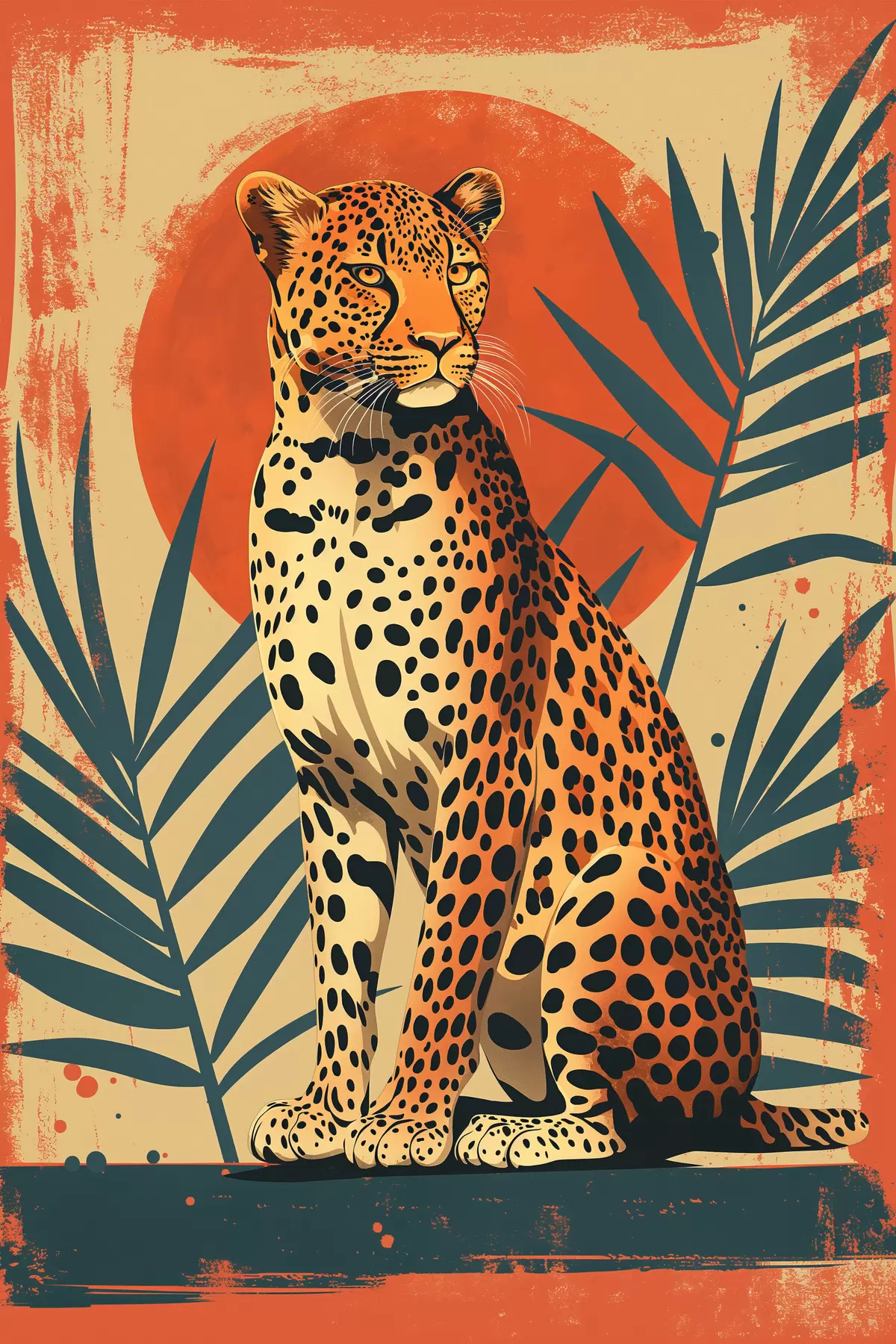 Plakatas Leopardo žvilgsnis: drąsi kompozicija su vasariškais palmių lapais ryškiai raudoname fone f39635