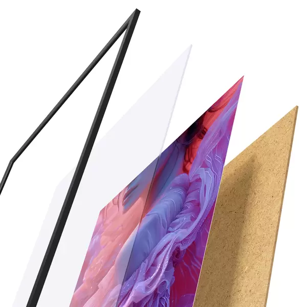 Plakatą sudaro rėmas, pleksiklas, atspausdintas vaizdas ir medžio drožlių plokštės pagrindas. Plakatą galima iš karto pakabinti ant sienos dėl kitoje pusėje esančių laikiklių.