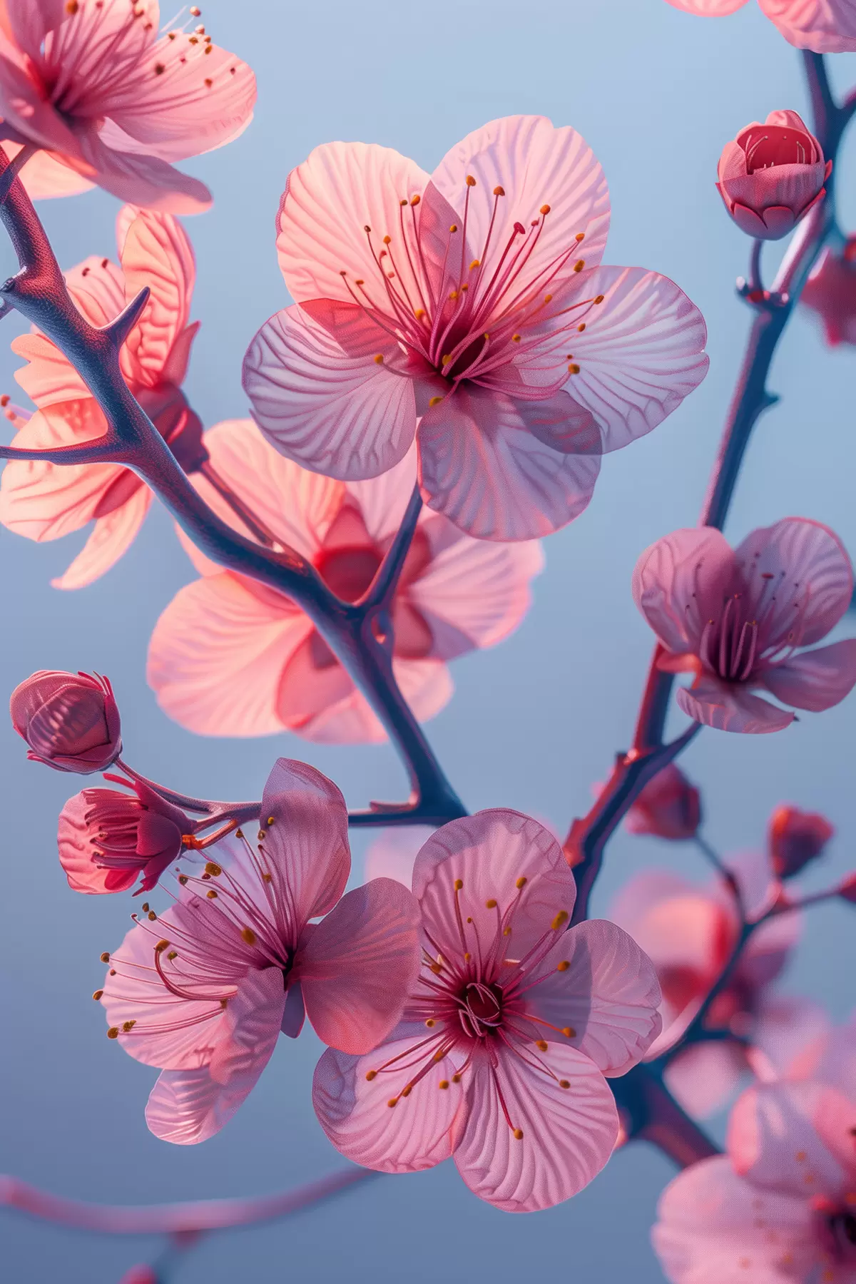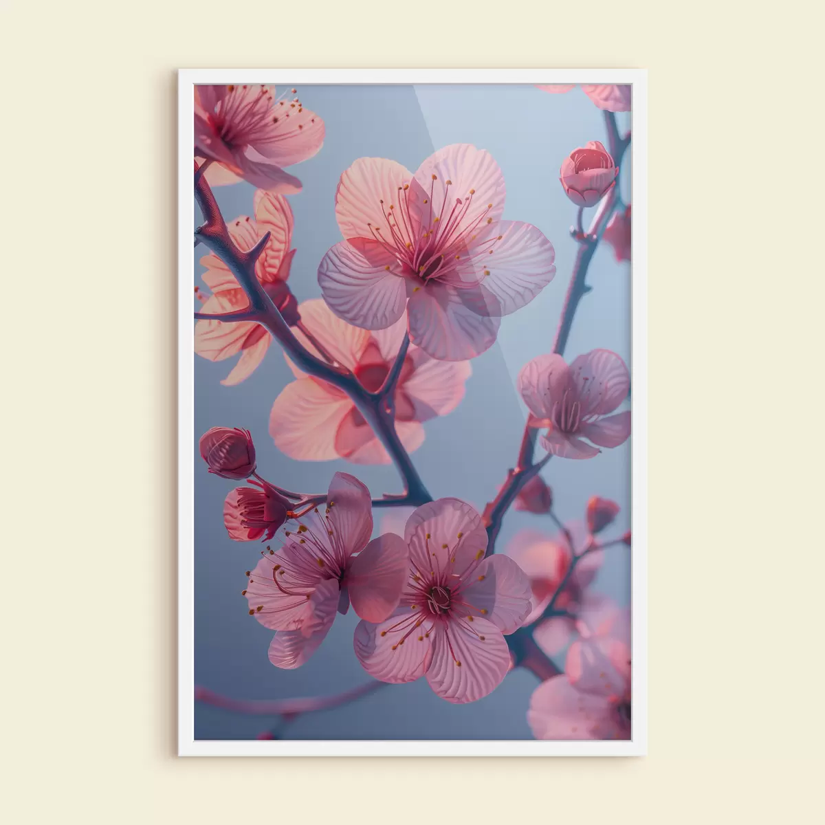 Plakatas Vyšnių žiedai purpuriniame fone su šviesiai oranžine ir šviesiai žydra spalva: soliarizacinis efektas f39644