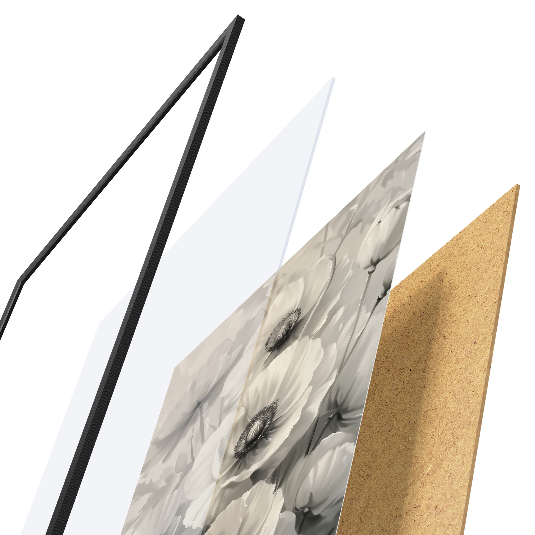 Plakatą sudaro rėmas, pleksiklas, atspausdintas vaizdas ir medžio drožlių plokštės pagrindas. Plakatą galima iš karto pakabinti ant sienos dėl kitoje pusėje esančių laikiklių.