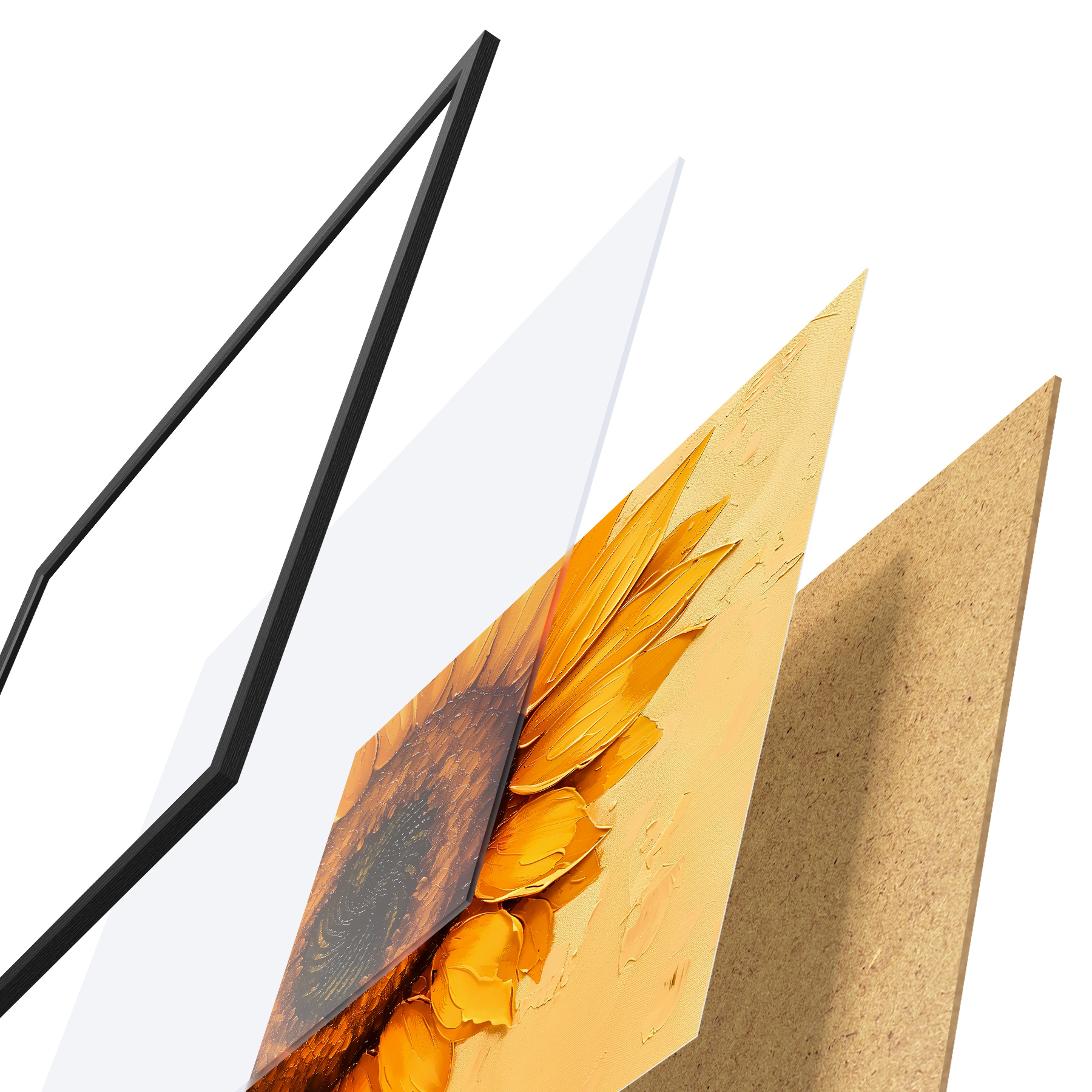 Plakatą sudaro rėmas, pleksiklas, atspausdintas vaizdas ir medžio drožlių plokštės pagrindas. Plakatą galima iš karto pakabinti ant sienos dėl kitoje pusėje esančių laikiklių.