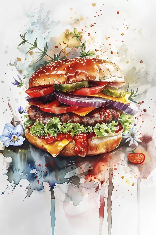 Plakatas Skanus mėsainis su mėsa, gėlėmis, akvarele, maisto menu f39699