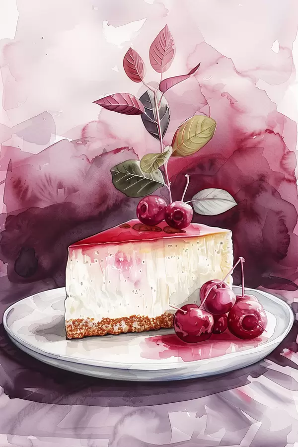 Plakatas Akvarelinis sūrio pyragas su vyšniomis, elegantiškas maisto menas, raudona ir violetinė spalvos Ne f39700