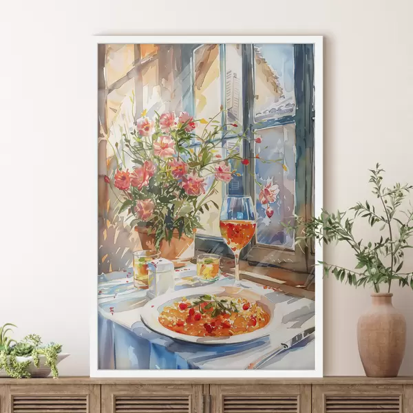 Plakatas Akvarelės šakelė, saulės šviesa lange, kokteilio taurė, vasaros gėlės Ne f39707