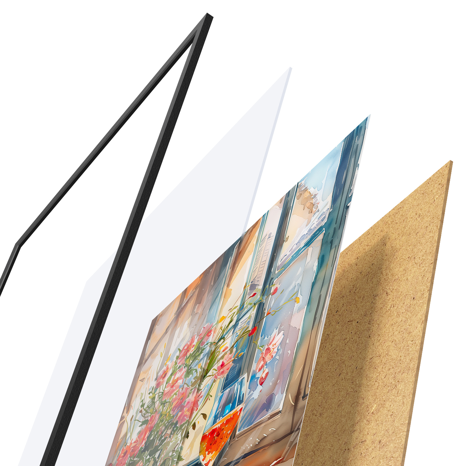 Plakatą sudaro rėmas, pleksiklas, atspausdintas vaizdas ir medžio drožlių plokštės pagrindas. Plakatą galima iš karto pakabinti ant sienos dėl kitoje pusėje esančių laikiklių.