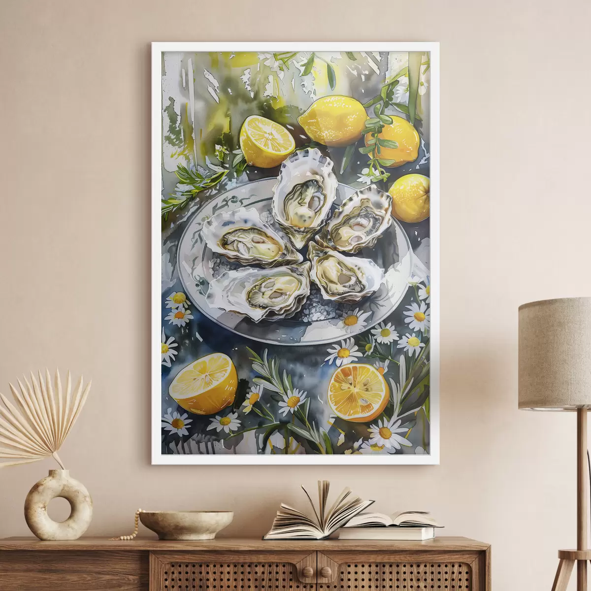 Plakatas Elegantiškos austrės lėkštėje, citrinos ir gėlės, vasariškos spalvos, Viduržemio jūros Ne f39710