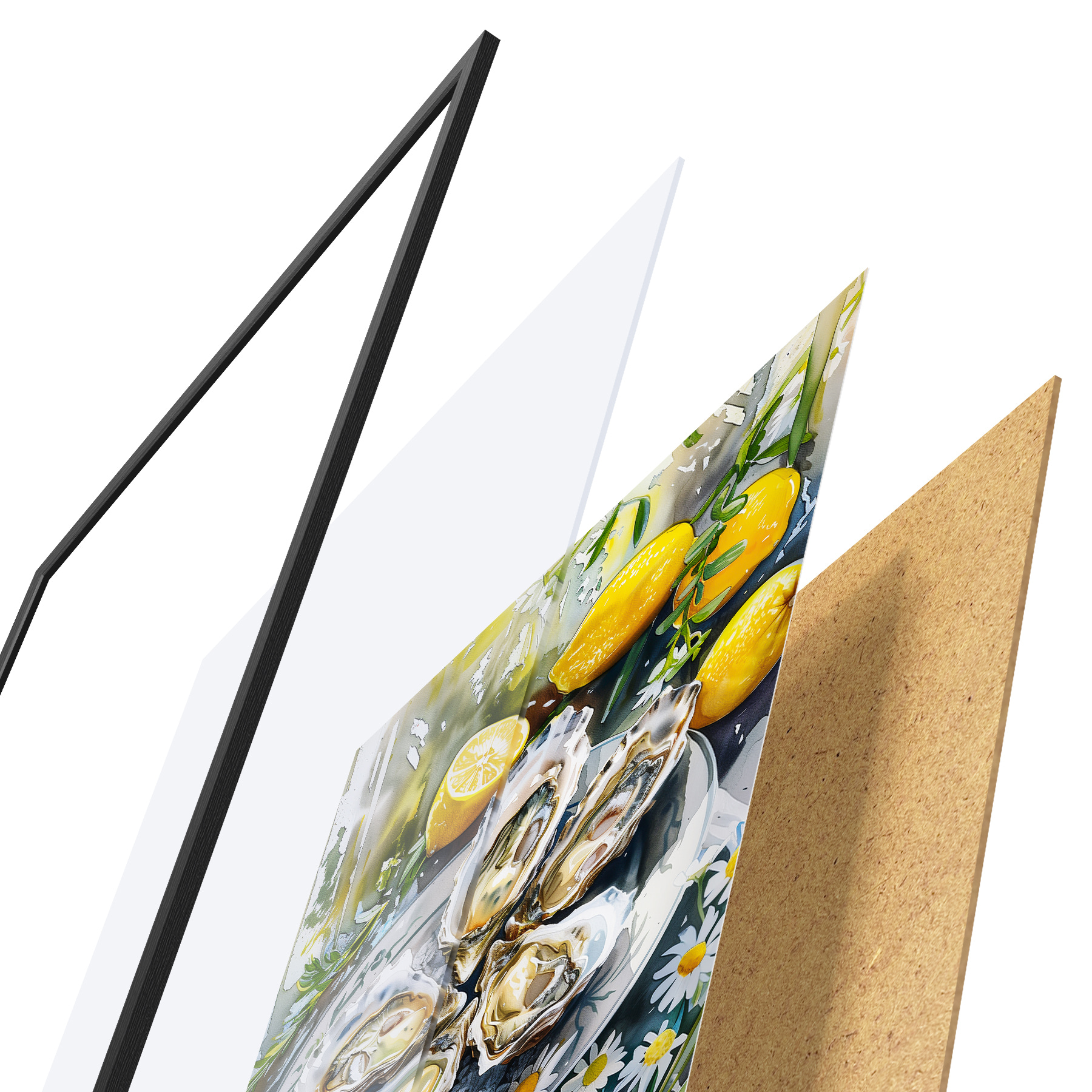 Plakatą sudaro rėmas, pleksiklas, atspausdintas vaizdas ir medžio drožlių plokštės pagrindas. Plakatą galima iš karto pakabinti ant sienos dėl kitoje pusėje esančių laikiklių.