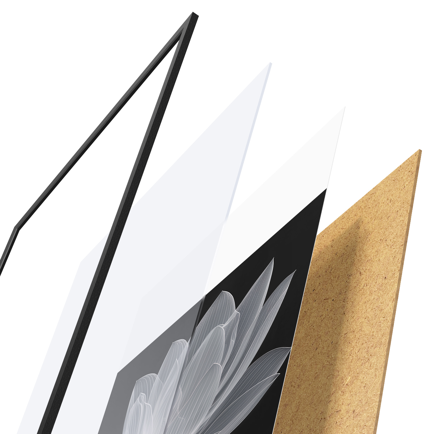 Plakatą sudaro rėmas, pleksiklas, atspausdintas vaizdas ir medžio drožlių plokštės pagrindas. Plakatą galima iš karto pakabinti ant sienos dėl kitoje pusėje esančių laikiklių.