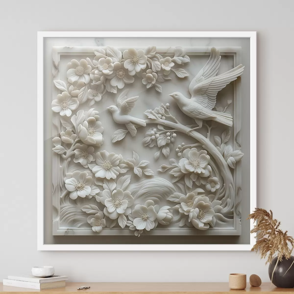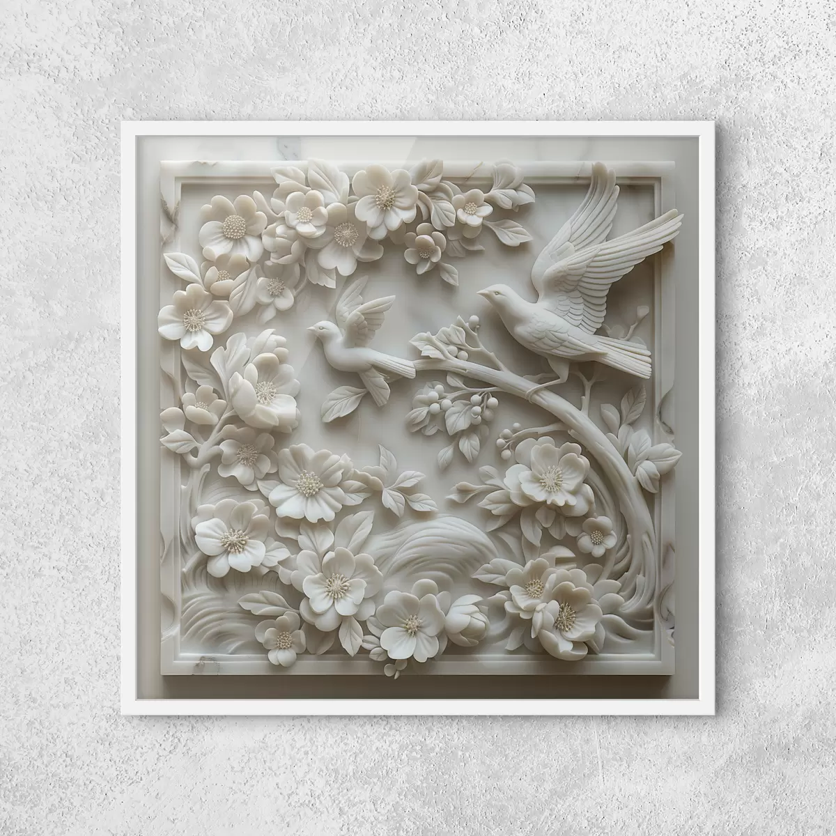 Plakatas Balto marmuro sodas su paukščių ir gėlių reljefais f39728