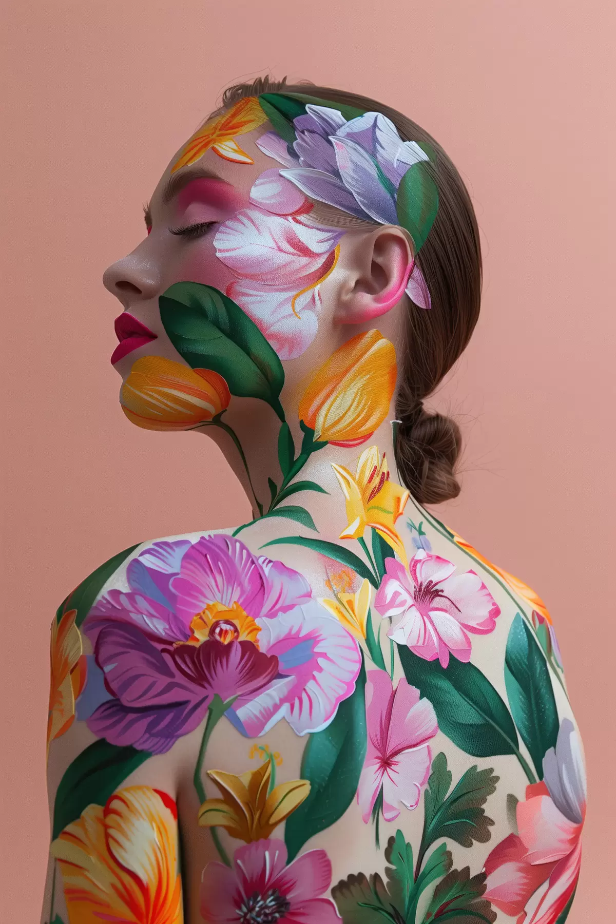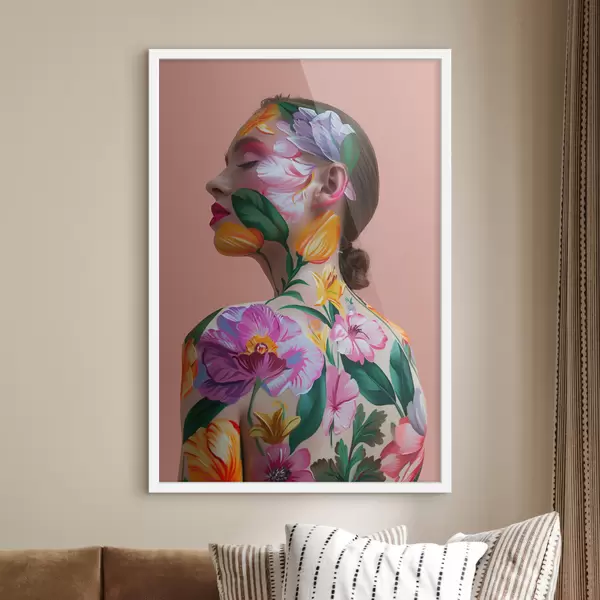 Plakatas Spalvingas gėlių dažų makiažas ant moters kūno f39732