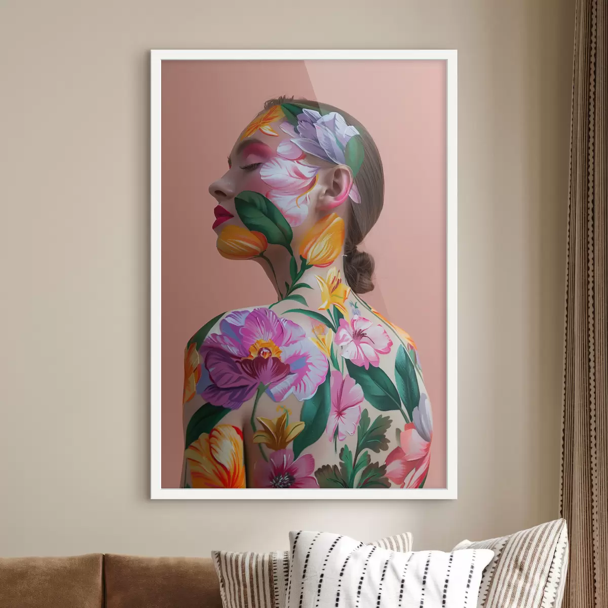 Plakatas Spalvingas gėlių dažų makiažas ant moters kūno Ne f39732