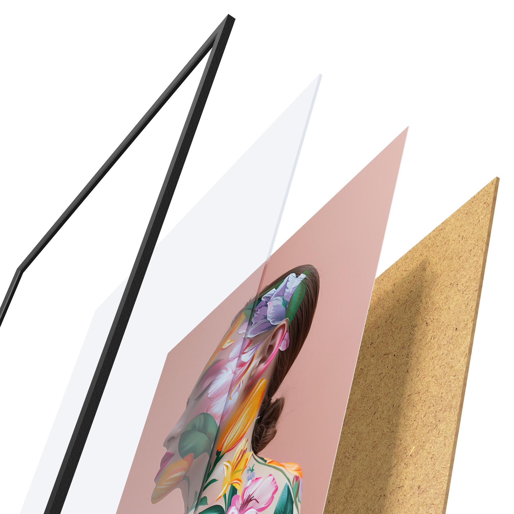 Plakatą sudaro rėmas, pleksiklas, atspausdintas vaizdas ir medžio drožlių plokštės pagrindas. Plakatą galima iš karto pakabinti ant sienos dėl kitoje pusėje esančių laikiklių.