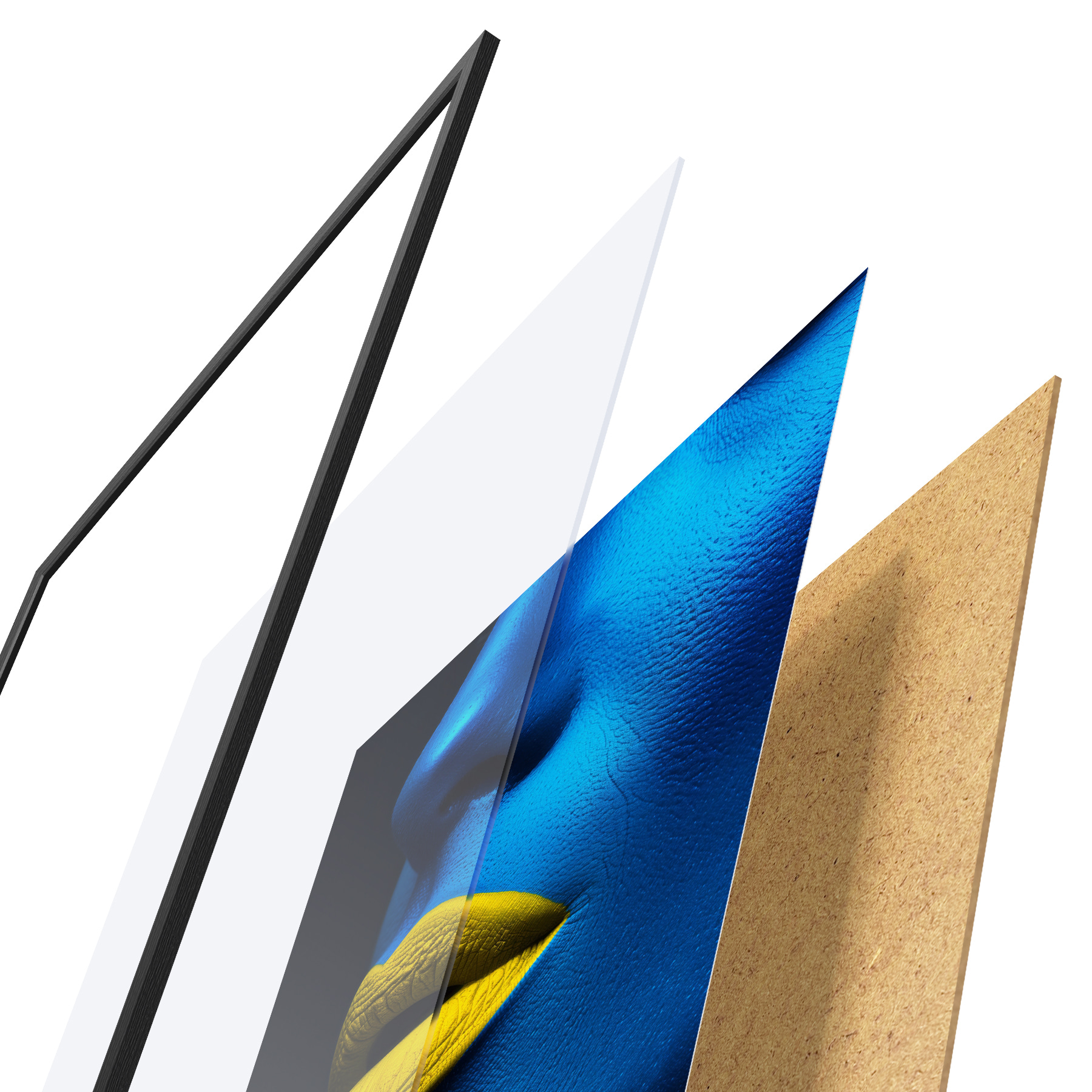 Plakatą sudaro rėmas, pleksiklas, atspausdintas vaizdas ir medžio drožlių plokštės pagrindas. Plakatą galima iš karto pakabinti ant sienos dėl kitoje pusėje esančių laikiklių.