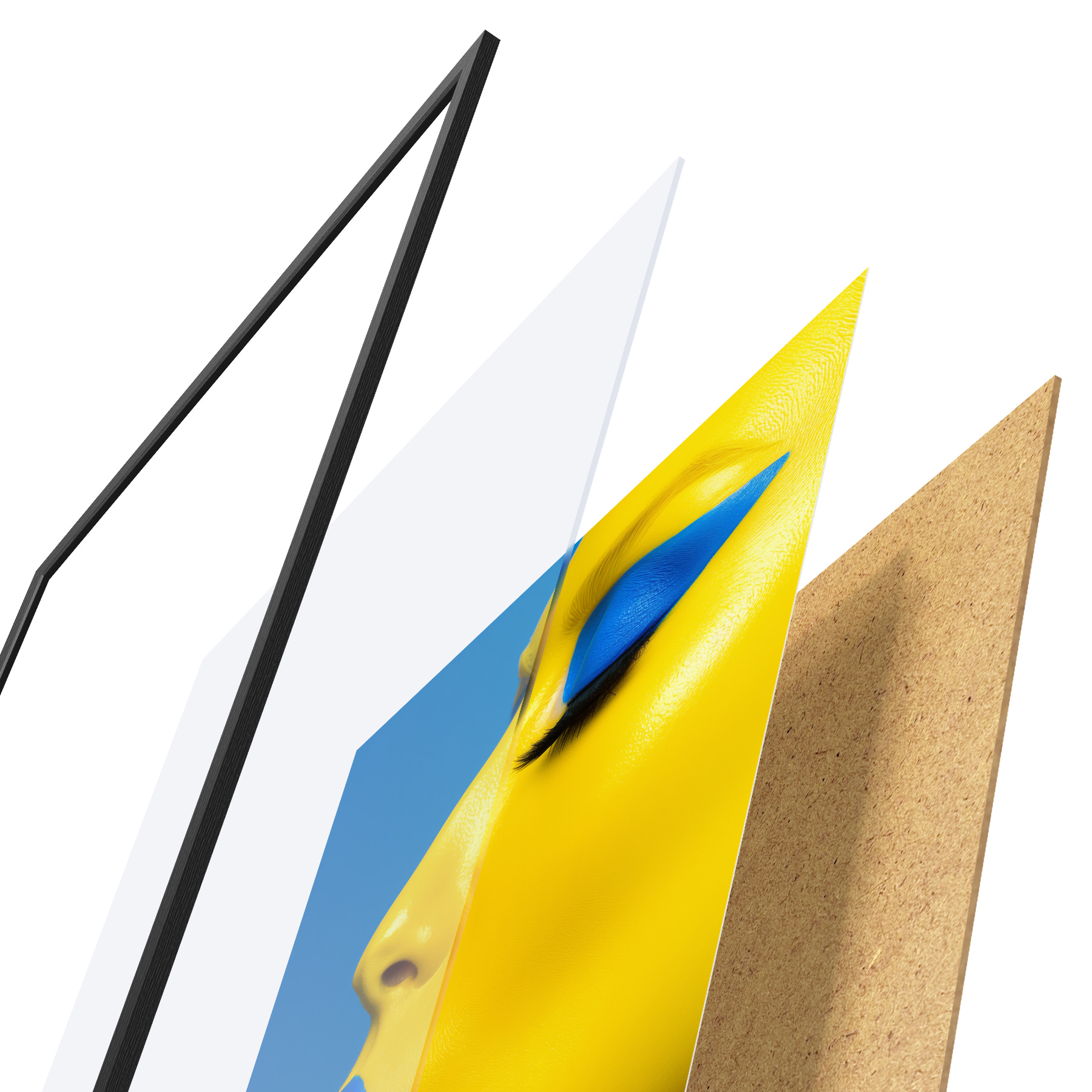 Plakatą sudaro rėmas, pleksiklas, atspausdintas vaizdas ir medžio drožlių plokštės pagrindas. Plakatą galima iš karto pakabinti ant sienos dėl kitoje pusėje esančių laikiklių.